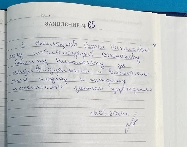 Я Гнилоухов Сергей Николаевич хочу поблагодарить Стенникову Галину Николаевну за индивидуальный и внимательный подход к каждому посетителю данного учреждения.