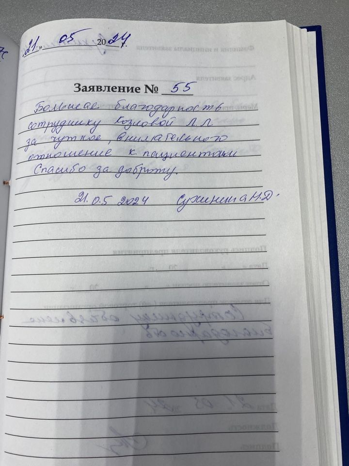 большая благодарность сотруднику Козловой Л.Л. за чуткое, внимательное отношение к пациентам. спасибо за доброту.