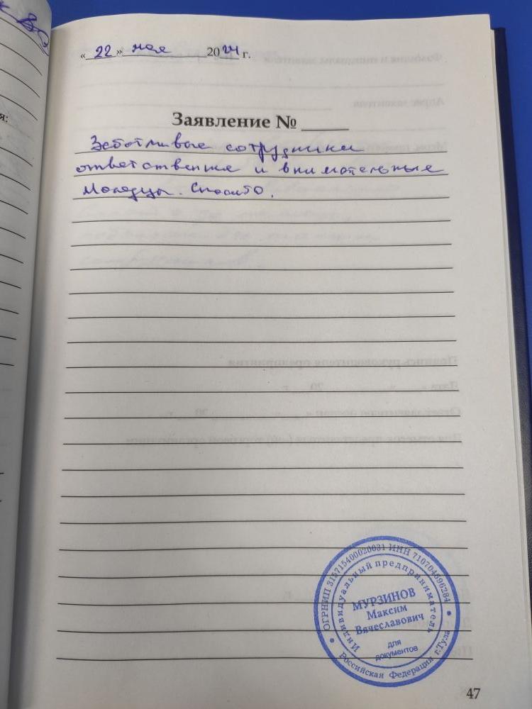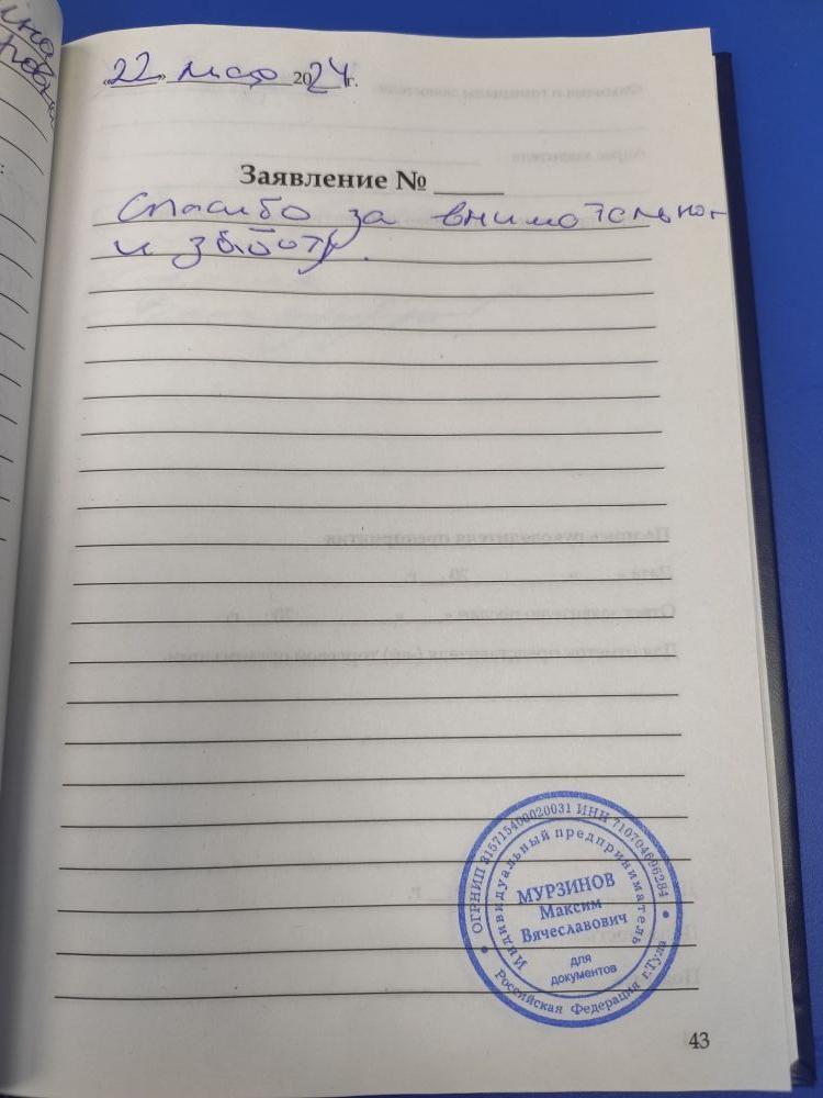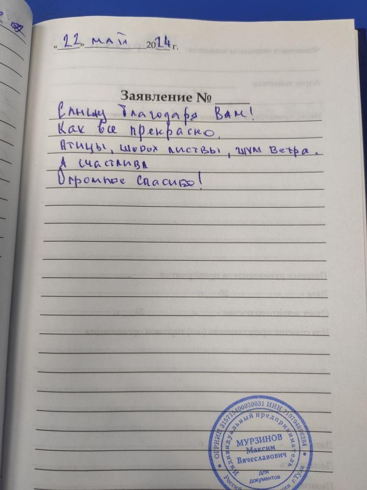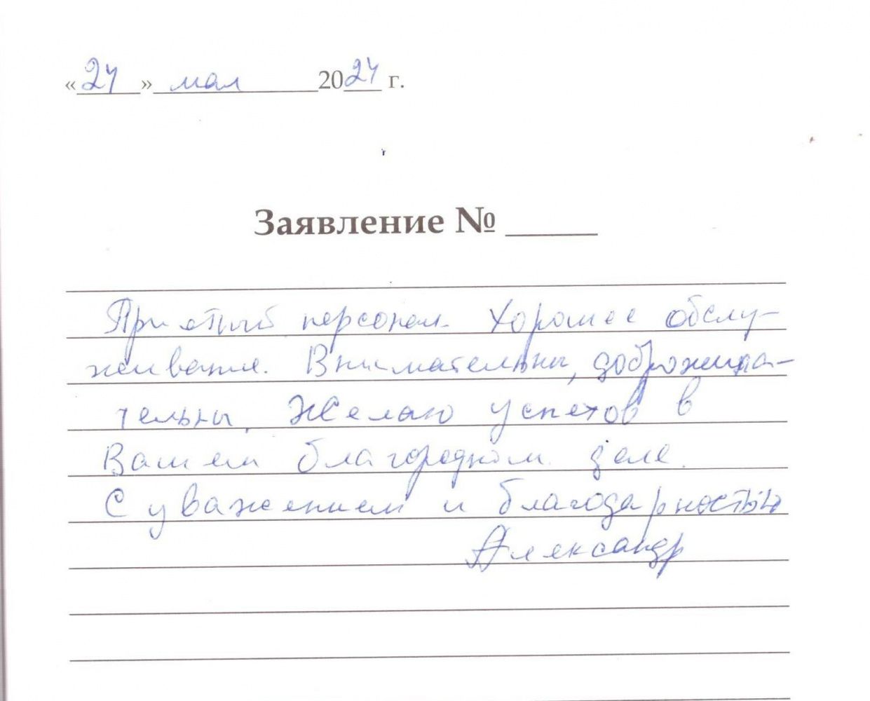 Приятный персонал. Хорошее обслуживание. Внимательны, доброжелательны. Желаю успехов в Вашем благородном деле. С уважением и благодарностью. Александр.