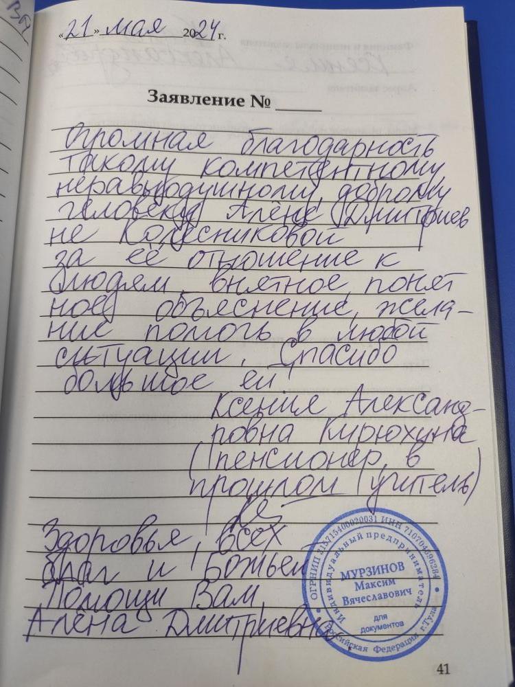 Огромная благодарность такому компетентному неравнодушному, доброму человеку Алене Дмитриевне Колесниковой, за ее отношение к людям, внятное, понятное объяснение, желание помочь в любой ситуации. Спасибо большое ей! Ксения Александровна Кирюхина (пенсионер в прошлом учитель) Здоровья всех благ и божьей помощи Вам Алена Дмитриевна.