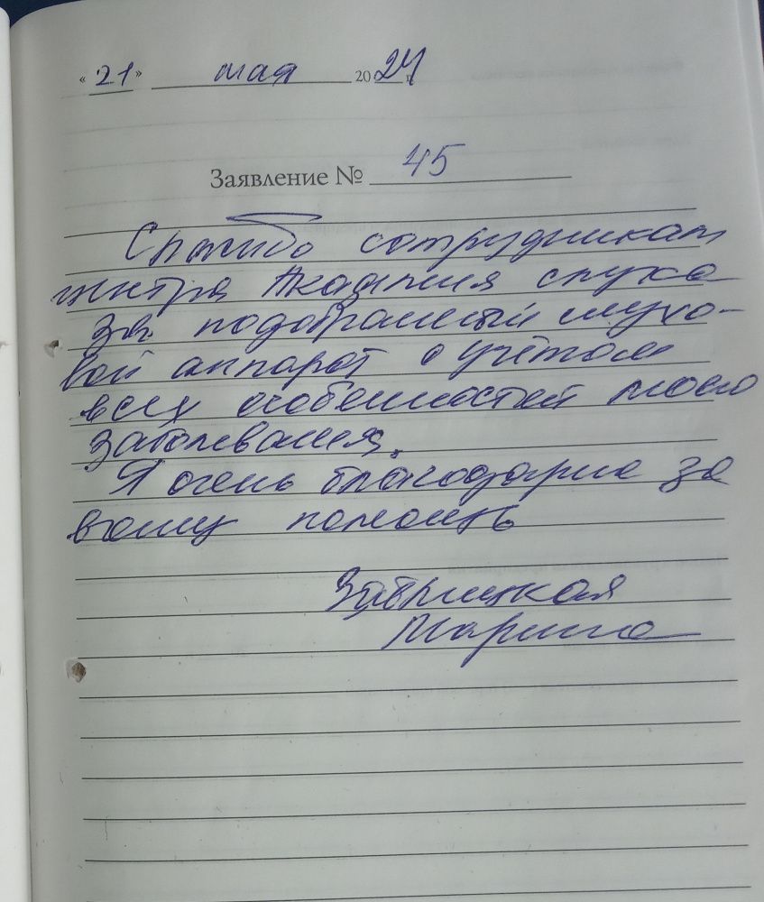 Спасибо сотрудникам центра за подобранный слуховой аппарат с учетом всех особенностей моего заболевания. Я очень благодарна за вашу помощь.