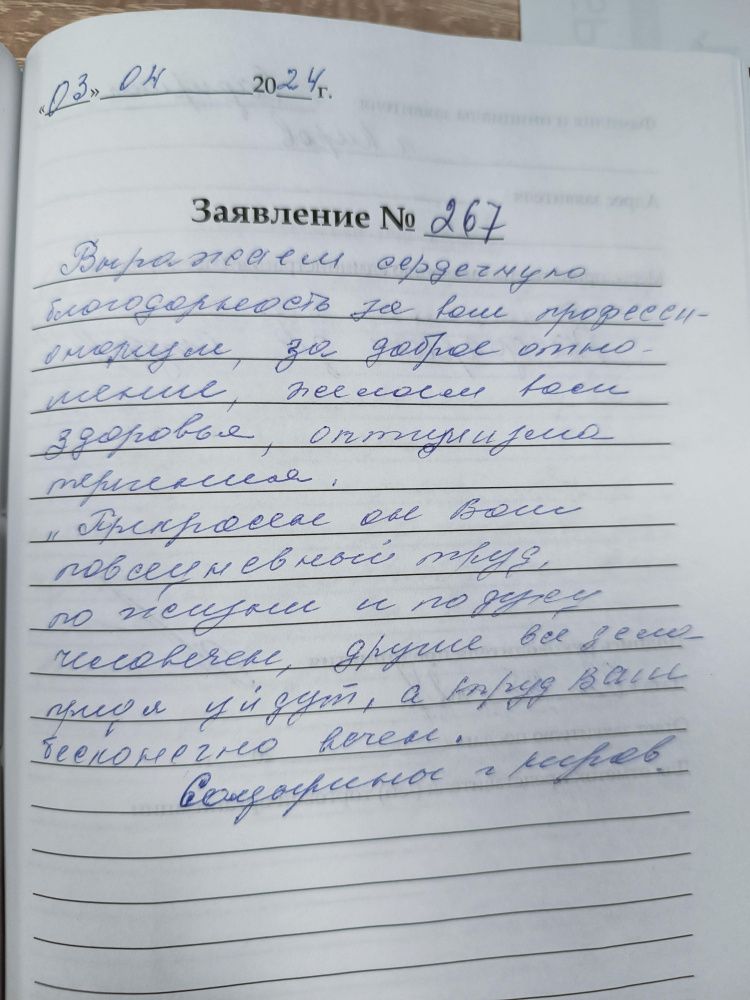 Выражаем сердечную благодарность за ваш профессионализм, за доброе отношение, желаем вам здоровья, оптимизма терпения. «Прекрасен он Ваш повседневный труд, по жизни и по духу человечен, другие все дела придя уйдут, а труд ВАШ бесконечно вечен. Садырины, г.Киров