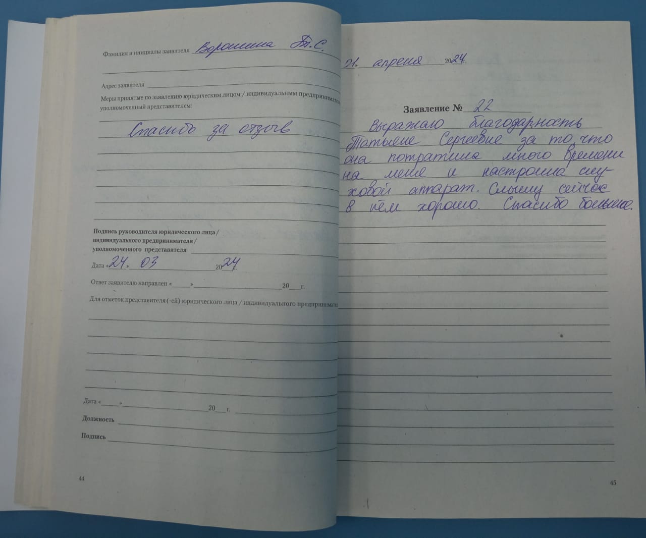 Выражаю благодарность Татьяне Сергеевне за то что она потратила много времени на меня и настроила слуховой аппарат. Слышу сейчас в нем хорошо. Спасибо большое.