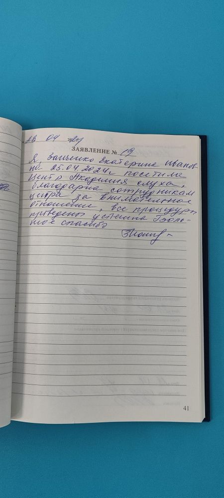 Я, Занченко Екатерина Ивановна 25.04.2024г. посетила Центр Академия слуха, благодарна сотрудникам центра за внимательное отношение , все процедуры проведены успешно. Большое спасибо.