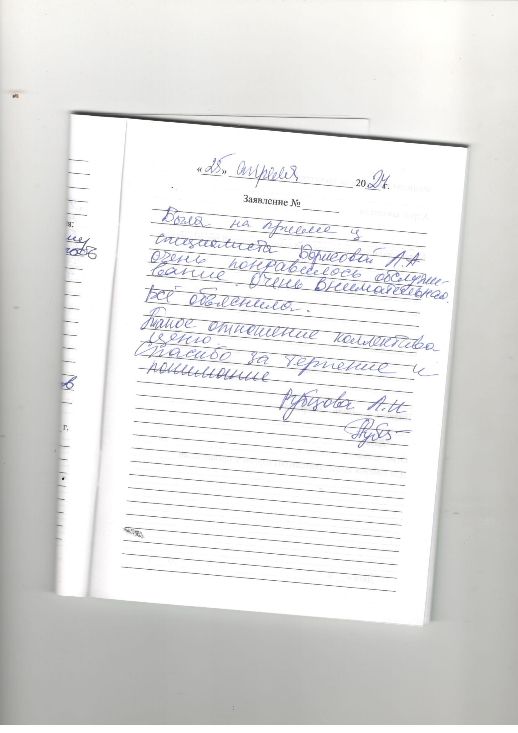 Была на приёме у специалиста Борисовой Л.А очень понравилось обслуживание. Очень внимательная. Всё объяснила. Такое отношение коллектива ценю. Спасибо за терпение и понимание.