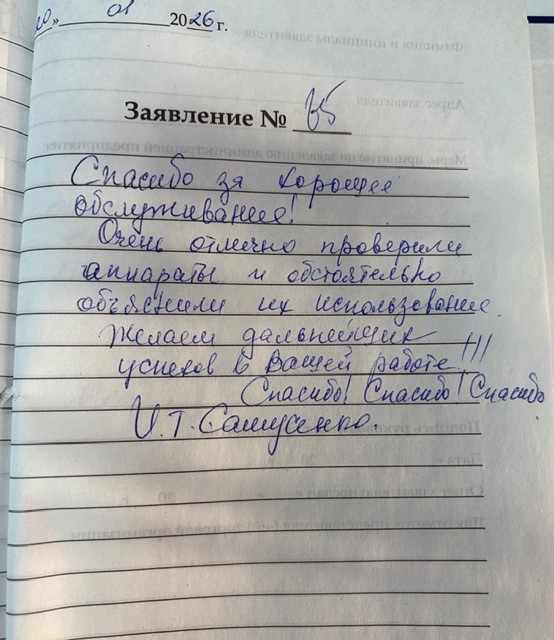 7. 20.01.2026 Спасибо за хорошее обслуживание. Очень отлично проверили аппараты и подробно объяснили их использование. Желаю дальнейших успехов в вашей работе! Спасибо! Спасибо! Спасибо! Самусенко И.Т