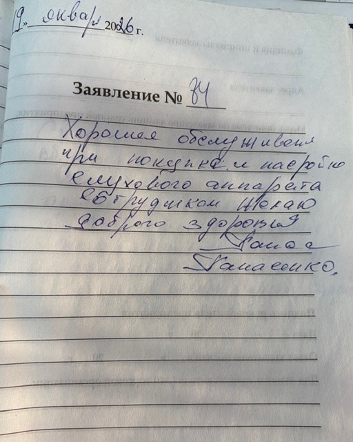 6. 19.01.2026 Хорошее обслуживание при покупке и настройке слухового аппарата. Сотрудникам желаю доброго здоровья. Панасенко С.В