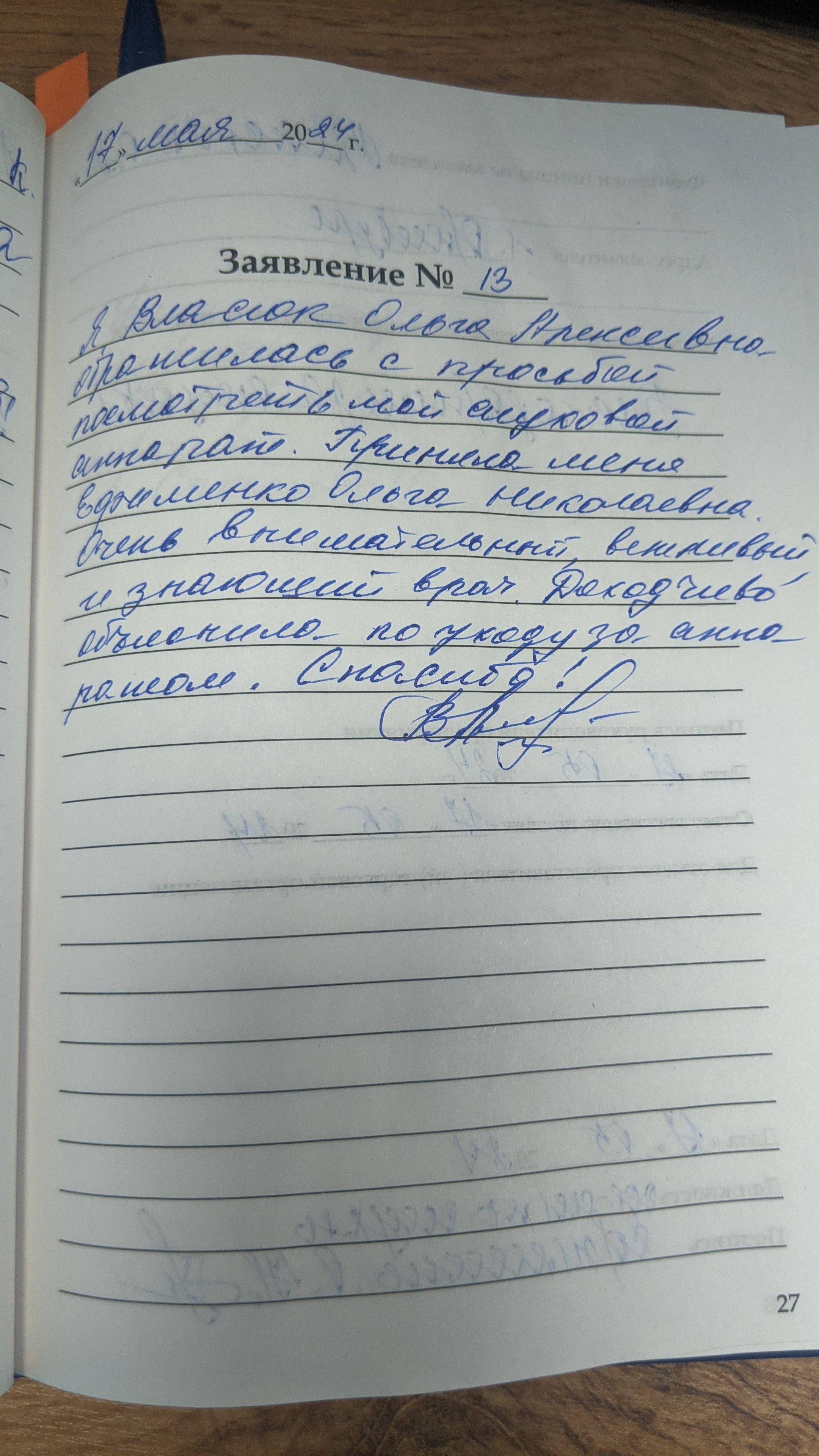 Благодарю Ольгу Николаевну за чуткое и грамотное отношение к клиенту. Спасибо за настройку слухового аппарата.
