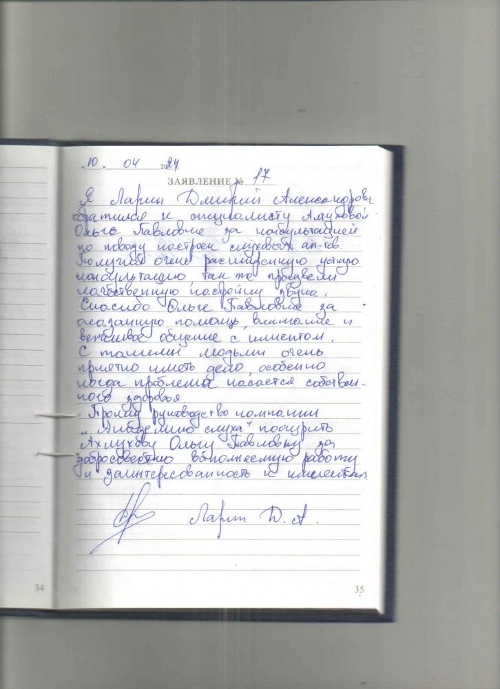 Я Ларин Дмитрий Александрович обратился к специалисту Алтуховой Ольге Павловне за консультацию по поводу настроек слуховых аппаратов получил очень расширенную устную консультацию также произвели качественный стройку звука Спасибо Ольге Павловне за оказанную помощь внимание и вежливое общение с клиентом. С такими людьми очень приятно иметь дело, Особенно когда проблема касается собственного здоровья. прошу руководство академии слуха поощрить Алтухова Ольгу Павловну за добросовестную выполненную работу и заинтересованность к клиентам.