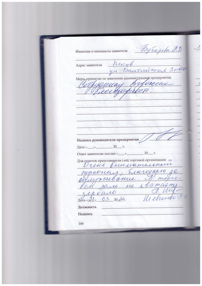 Очень внимательный персонал, благодарю за обслуживание. В торговом зале не хватает зеркала.