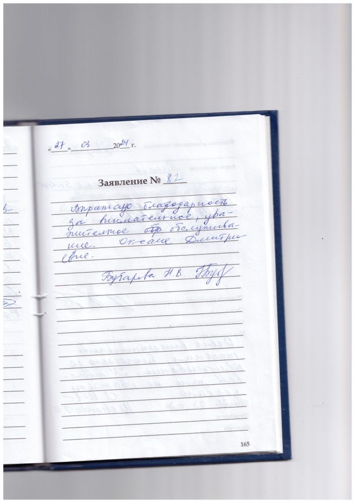 Выражаю благодарность за внимательное, уважительное обслуживание. Оксане Дмитриевне.