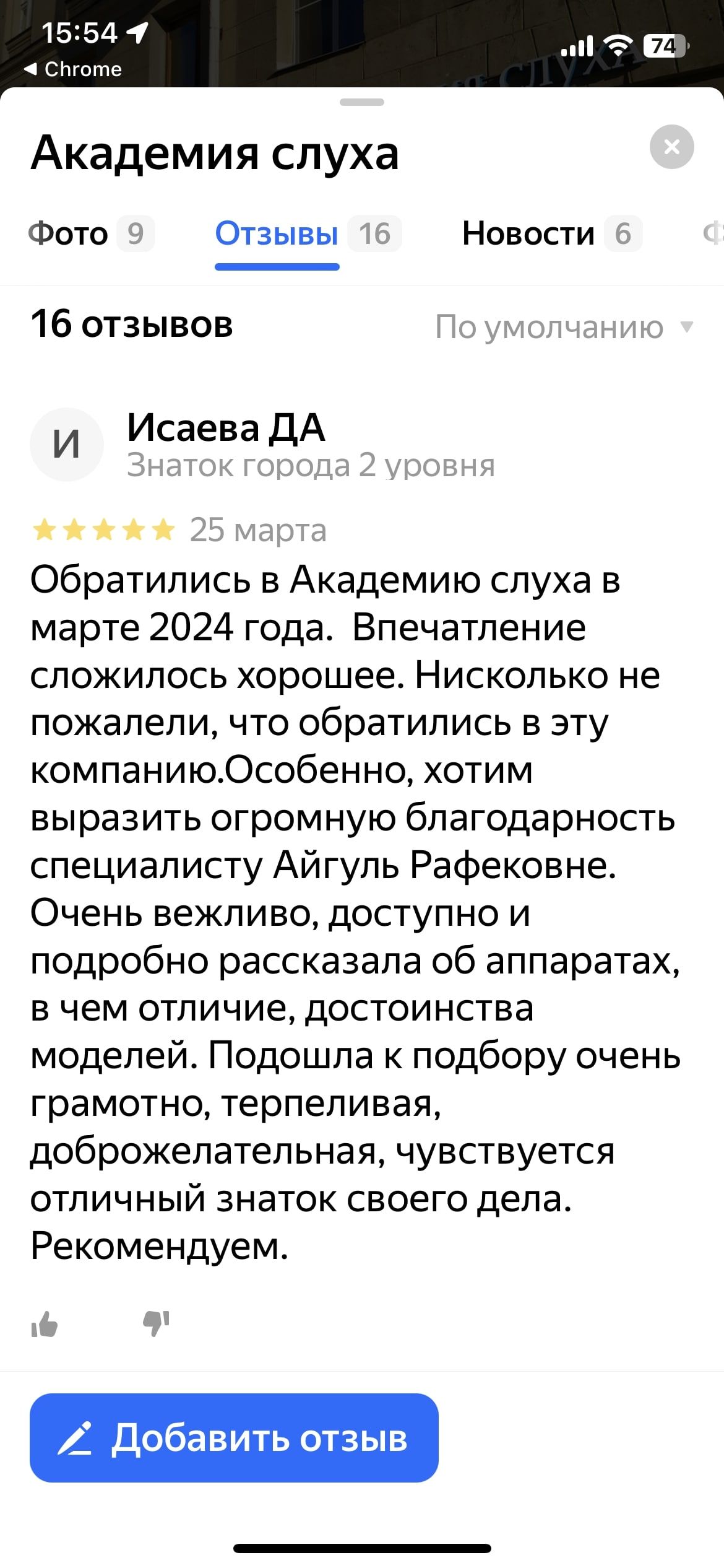 Обратились в Академию слуха в марте 2024г. Впечатление сложилось хорошее. Нисколько не пожалели, что обратились в эту компанию. Особенно, хотим выразить огромную благодарность специалисту Айгуль Рафековне. Очень вежливо, доступно и подробно рассказала об аппаратах, в чем отличие, достоинства моделей. Подошла к подбору очень грамотно, терпеливая, доброжелательная, чувствуется отличный знаток своего дела. Рекомендуем.