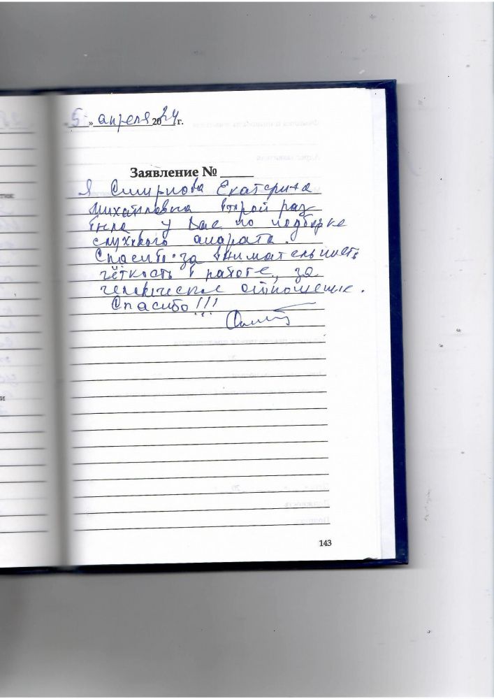 Я, Смирнова Екатерина Михайловна, второй раз была у Вас по подборке слухового аппарата. Спасибо за внимательность, четкость в работе, за человеческое отношение. Спасибо!!!