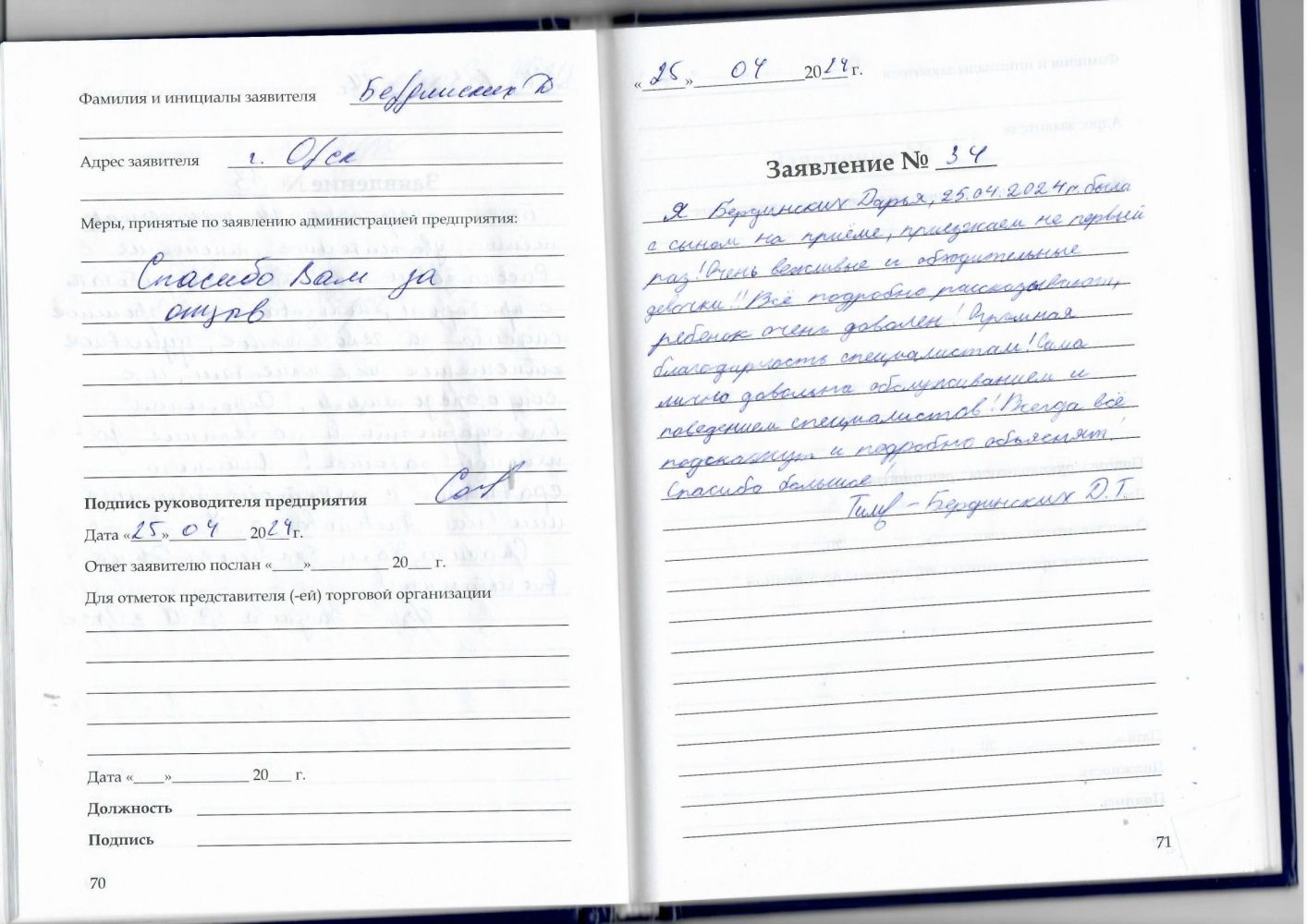 Я, Бердинских Дарья, 25.04.2024г. была с сыном на приёме, приезжаем не первый раз! Очень вежливые и обходительные девочки!!! Всё подробно рассказывают, ребёнок очень доволен! Огромная благодарность специалистам! Сама лично довольна обслуживанием и поведением специалистов! Всегда всё подскажут и подробно объяснят!