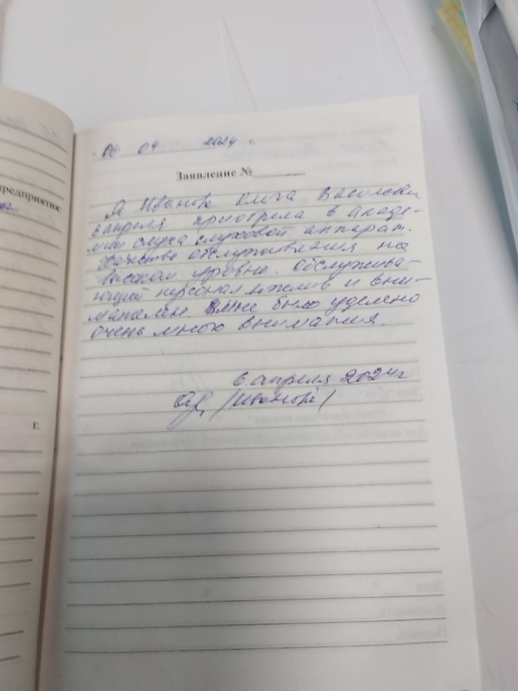 Я, Иванова Ольга Васильевна 6 апреля приобрела в Академии слуха слуховой аппарат. Качество обслуживания на высоком уровне. Обслуживающий персонал вежлив и внимателен. Мне было уделено очень много внимания.