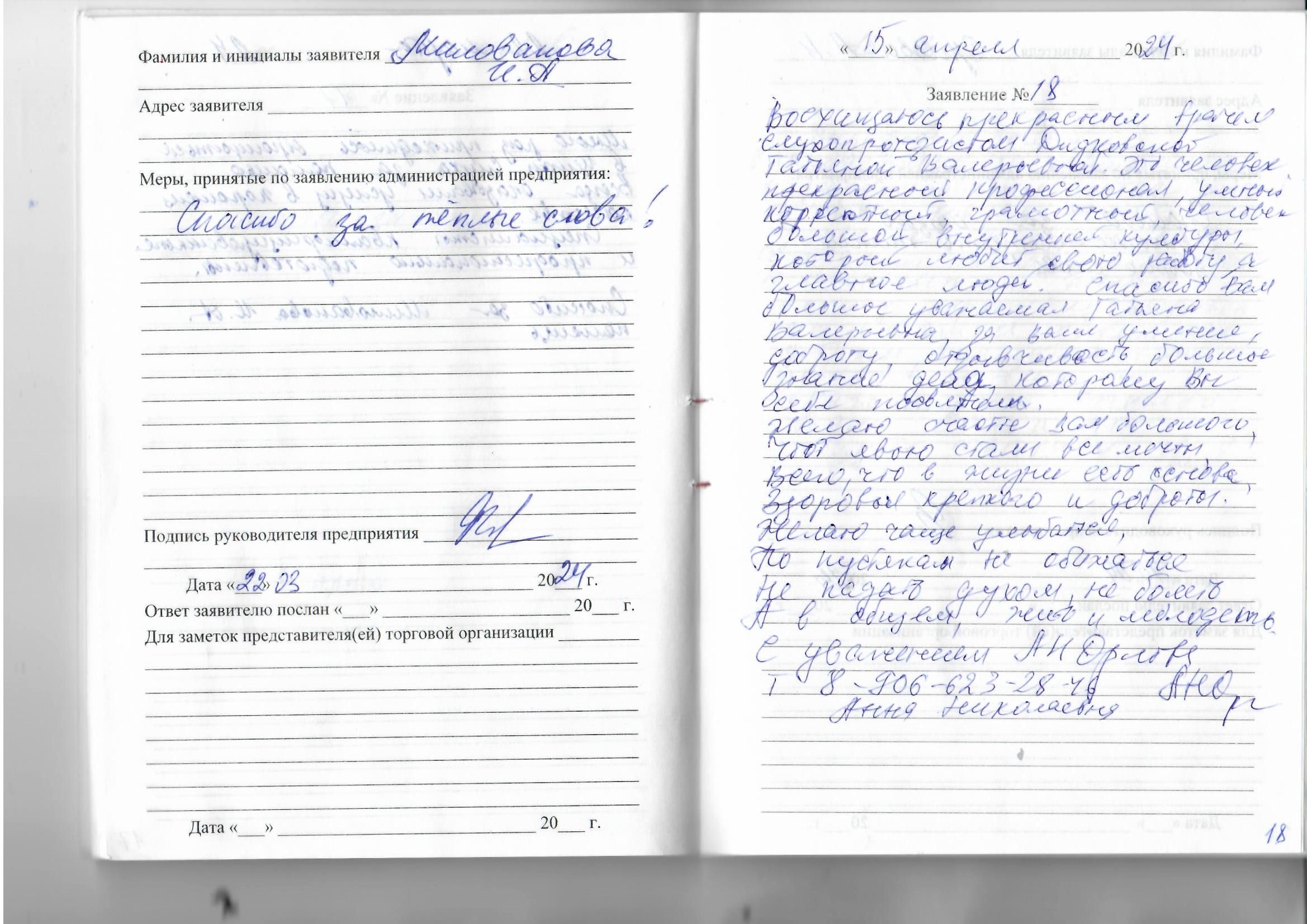 Спасибо вам большое, уважаемая Татьяна Валерьевна, за ваше умение, доброту, отзывчивость, большое знание дела, которому вы себя посветили.