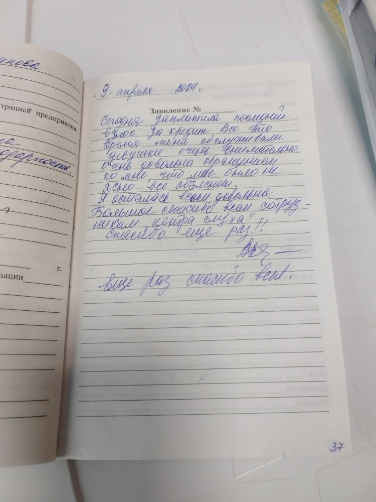 Сегодня заплатила последний взнос за кредит. Все это время меня обслуживали девушки очень внимательно. Очень довольна обращением ко мне, что мне было все объяснят. Я осталась очень довольна. Большое спасибо всем сотрудникам центра слуха. Еще раз спасибо всем!