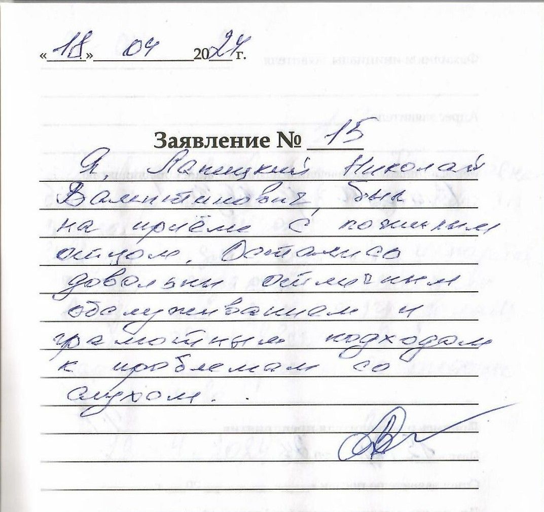 Я, Лапицкий Николай Валентинович, был на приёме с пожилым отцом. Остались довольны отличным обслуживанием и грамотным подходом к проблемам со слухом.