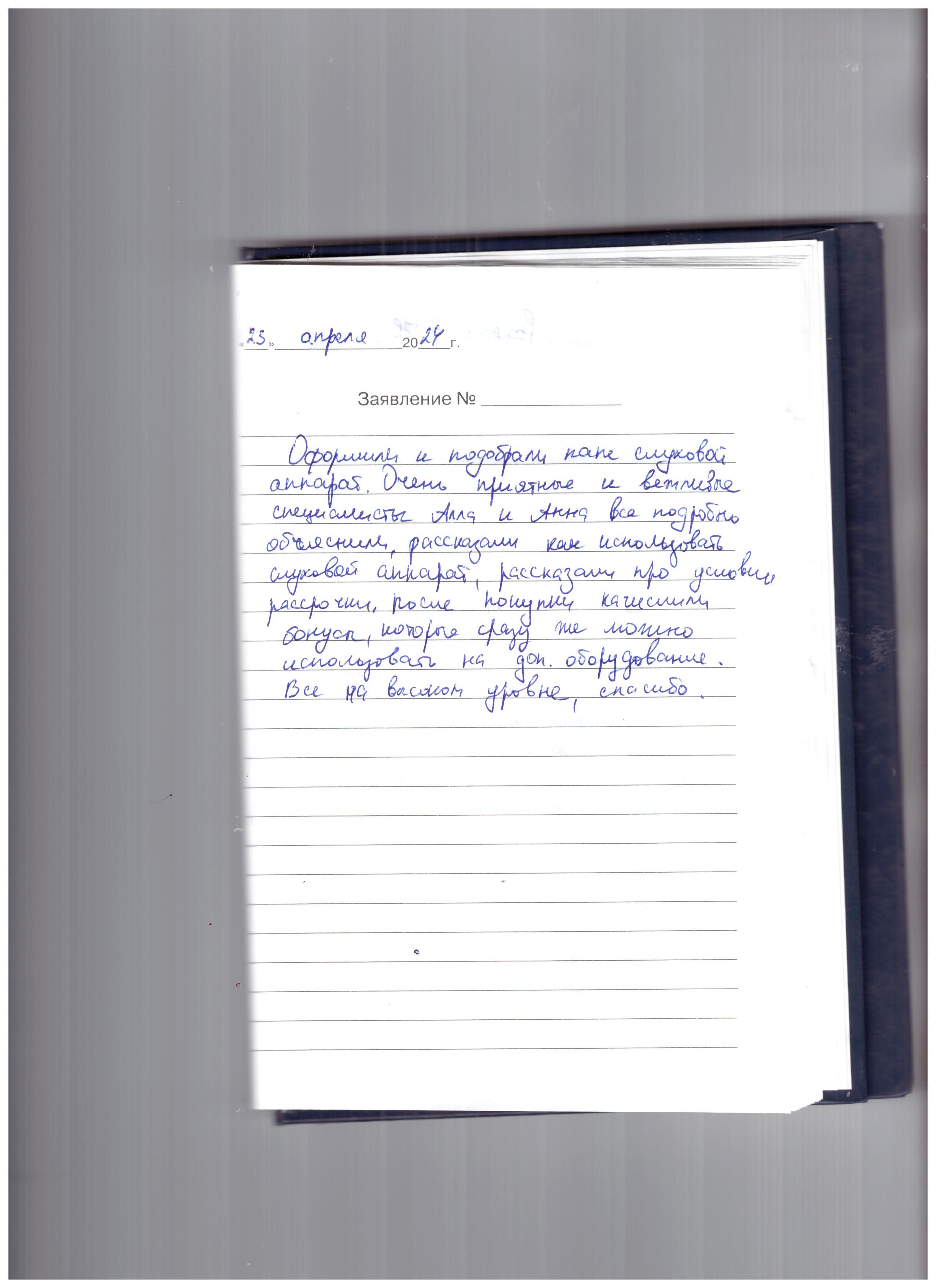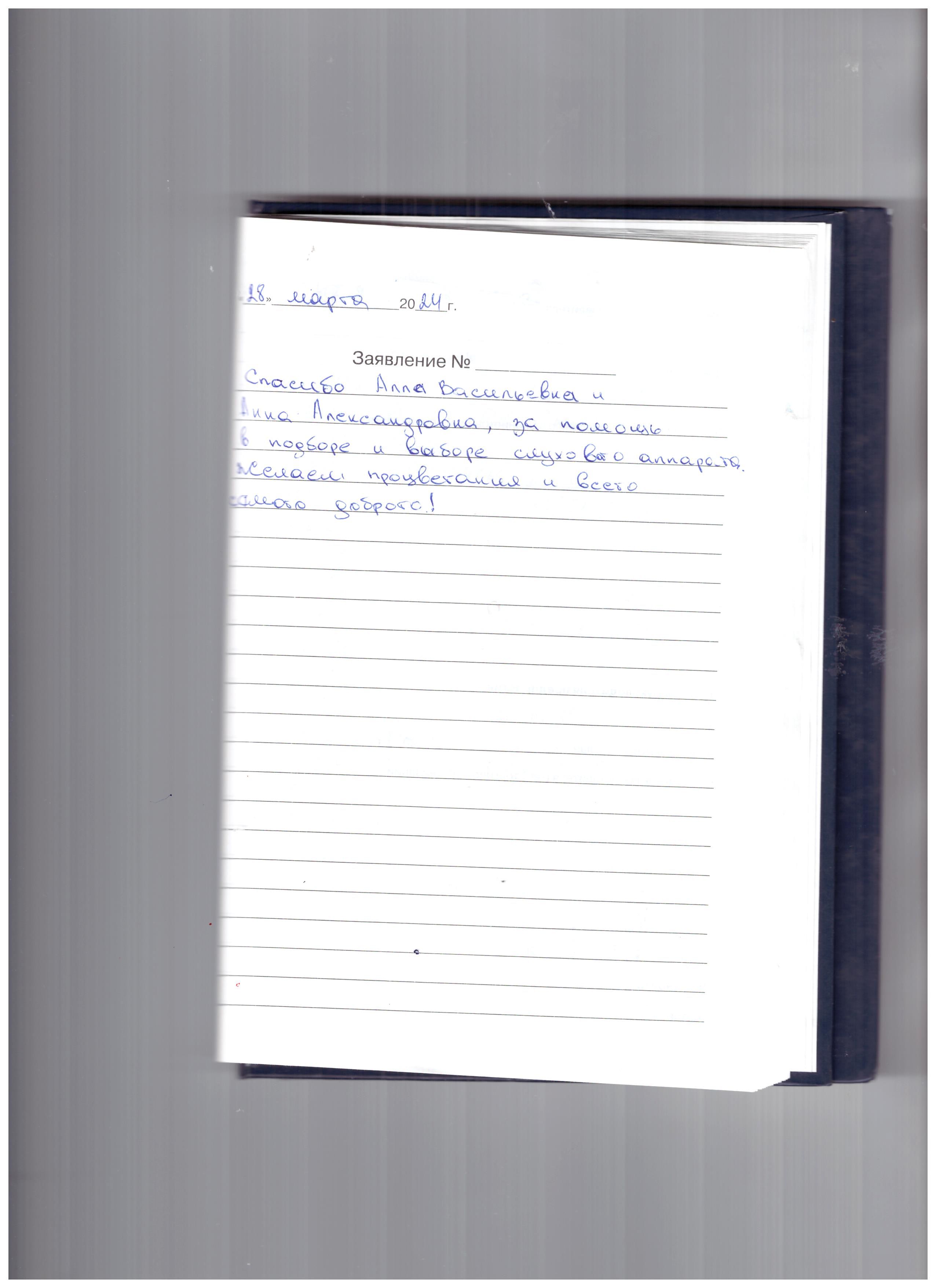 Прошу объявить благодарность специалисту за качественную работу. 25.04. привезла маму на подбор аппарата. Полусили полную консультацию по вопросам слуха.