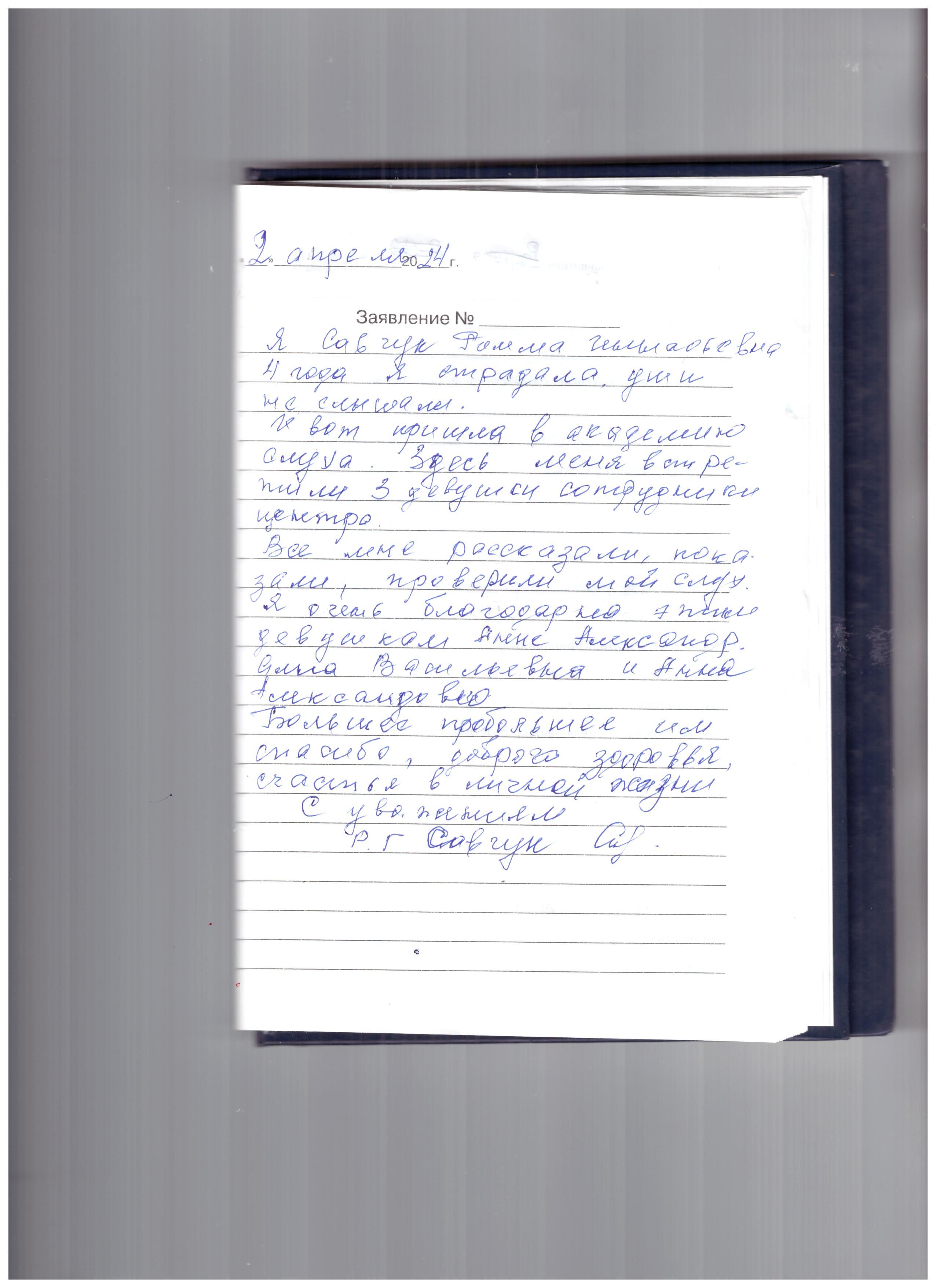 Я Савчук Римма Геннадьевна. 4 года я страдала, уши не слышали. И вот пришла в Академию слуха. Здесь меня встретили 3 девушки сотрудники центра. Всё мне рассказали, показали, проверили мой слух. Я очень благодарна этим девушкам Анне Александровне, Алла Васильевна и Анна Александровна. Большое пребольшое им спасибо, доброго здоровья, счастья в личной жизни.
