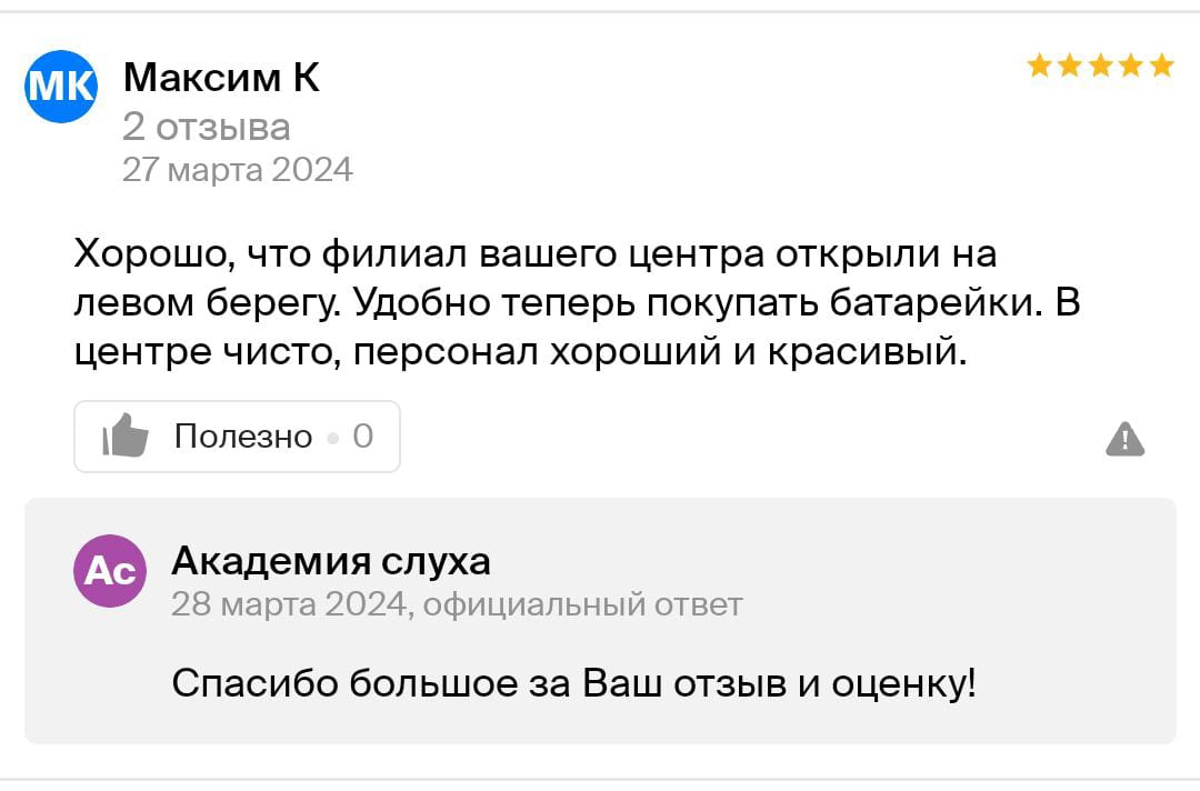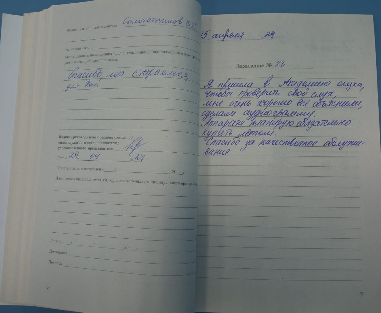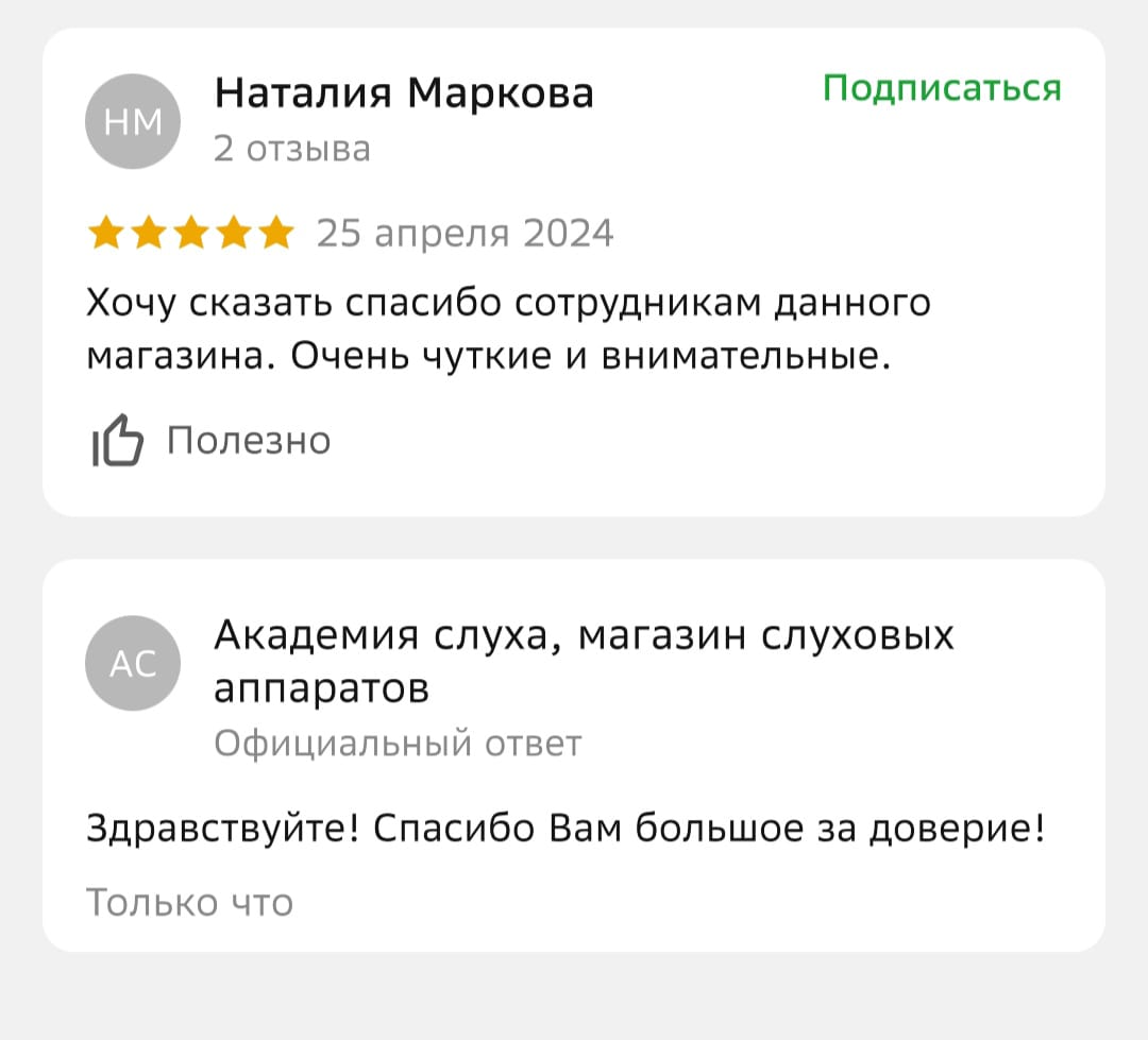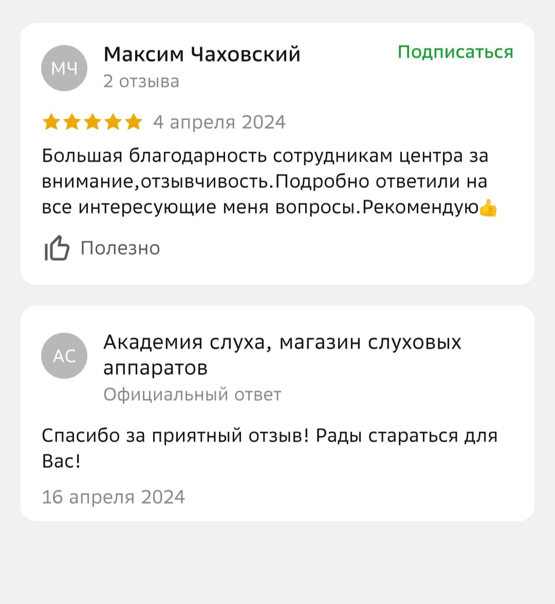 Как постоянная клиентка "Академии слуха" (Гуляева Т.П.) хочу выразить огромную благодарность за внимание к клиентам. Оказание помощи. Работники всегда идут навстречу и по возможности принимают раньше назначенного срока. Спасибо за Вашу работу! Удачи Вам, здоровья и мирного неба над головой!