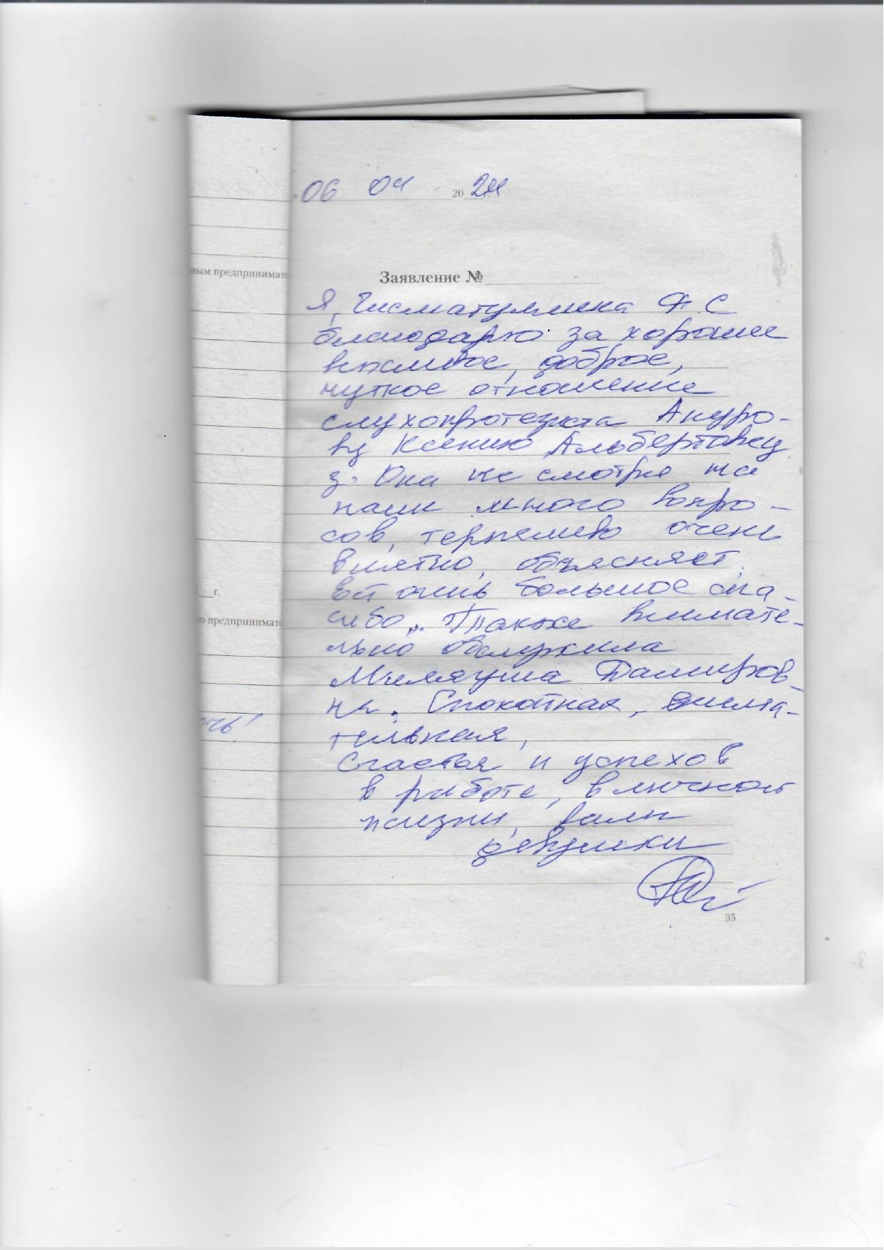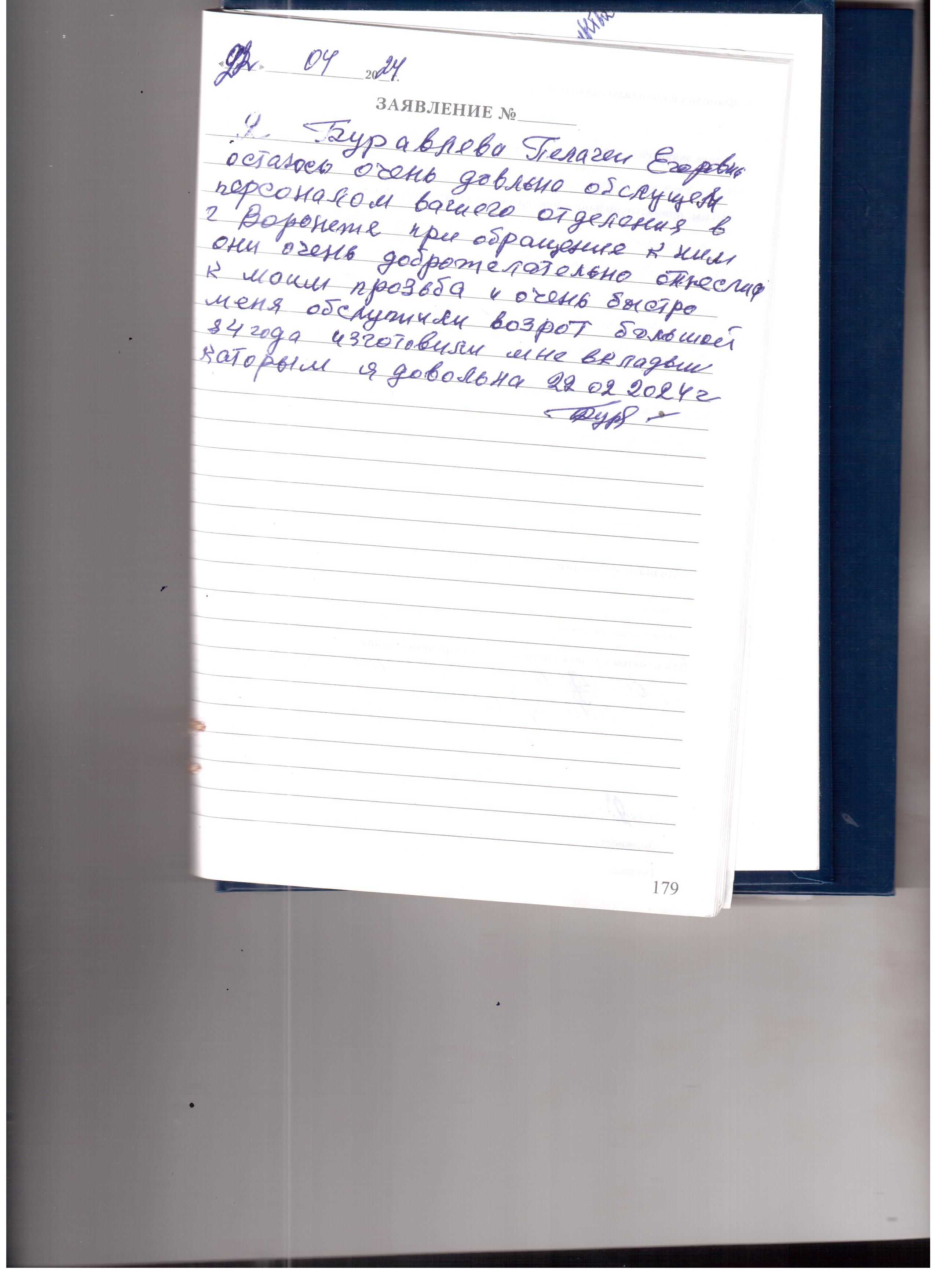 Я, Буравлева Пелагея Егоровна остаюсь очень довольна обслуживанием персонала вашего отделения в Воронеже. При обращении к ним они очень доброжелательно отнеслись к моей просьбе и очень быстро меня обслужили. Возраст большой, 84, изготовили мне вкладыши, которыми я довольна.