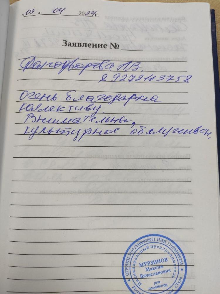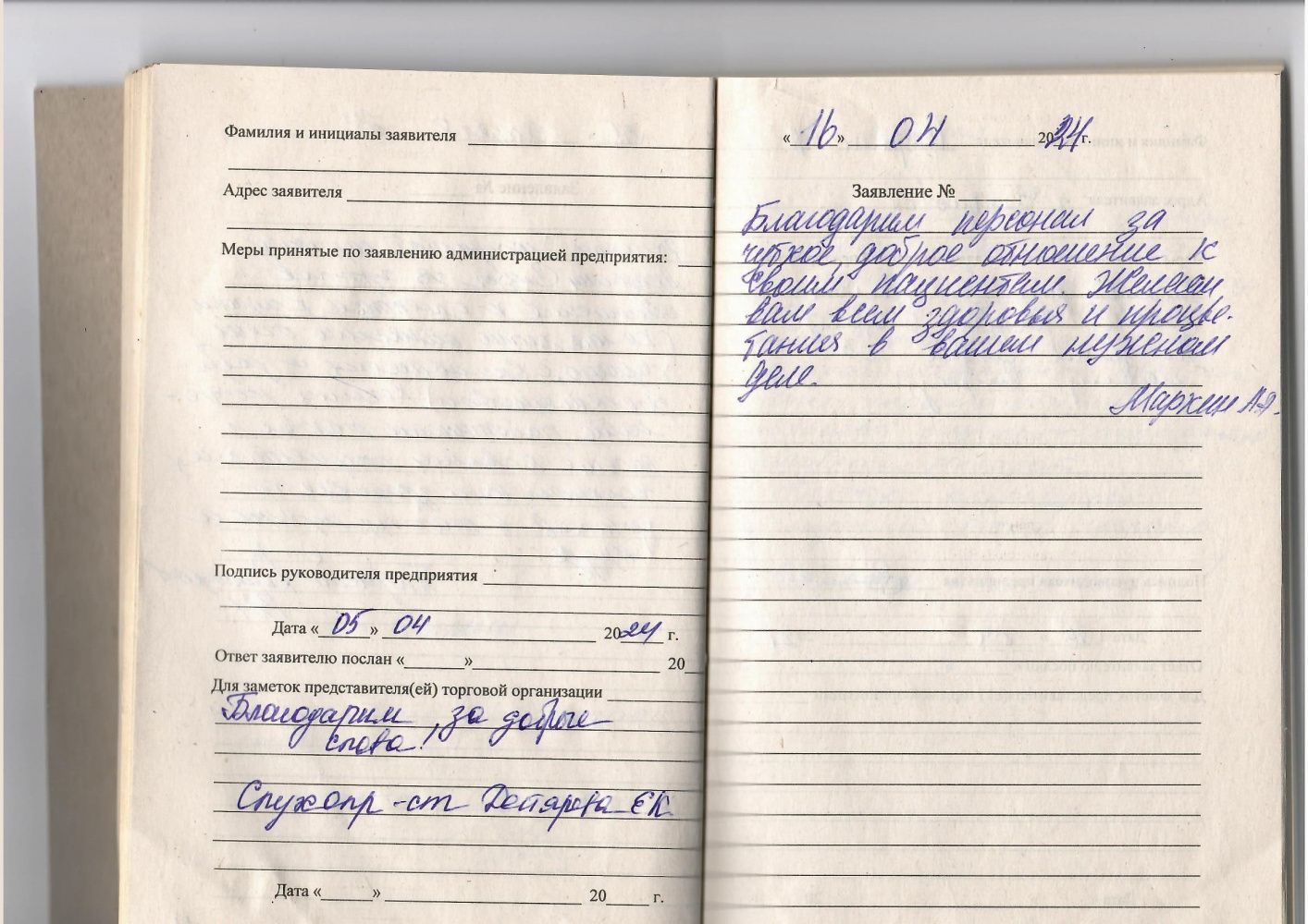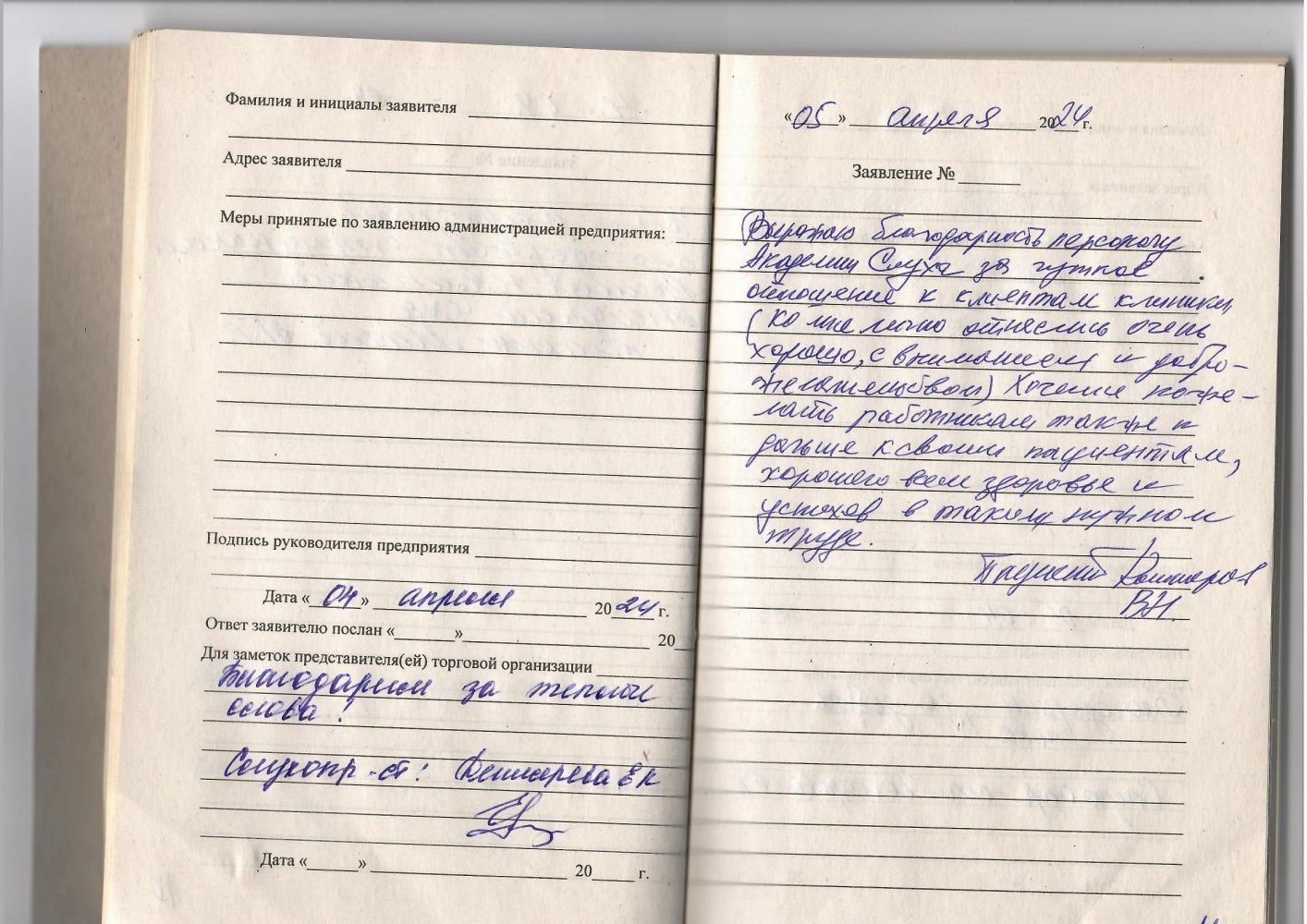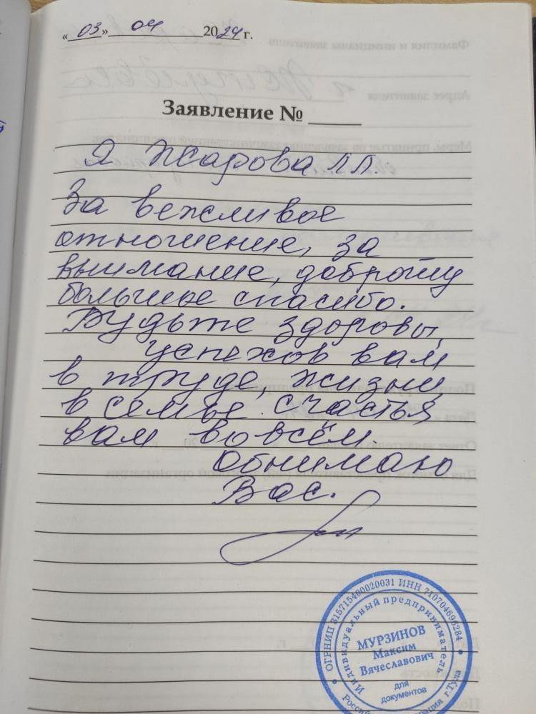 Благодарим персонал за чуткое, доброе отношение к своим пациентам. Желаем вам всем здоровья и процветания в вашем нужном деле.