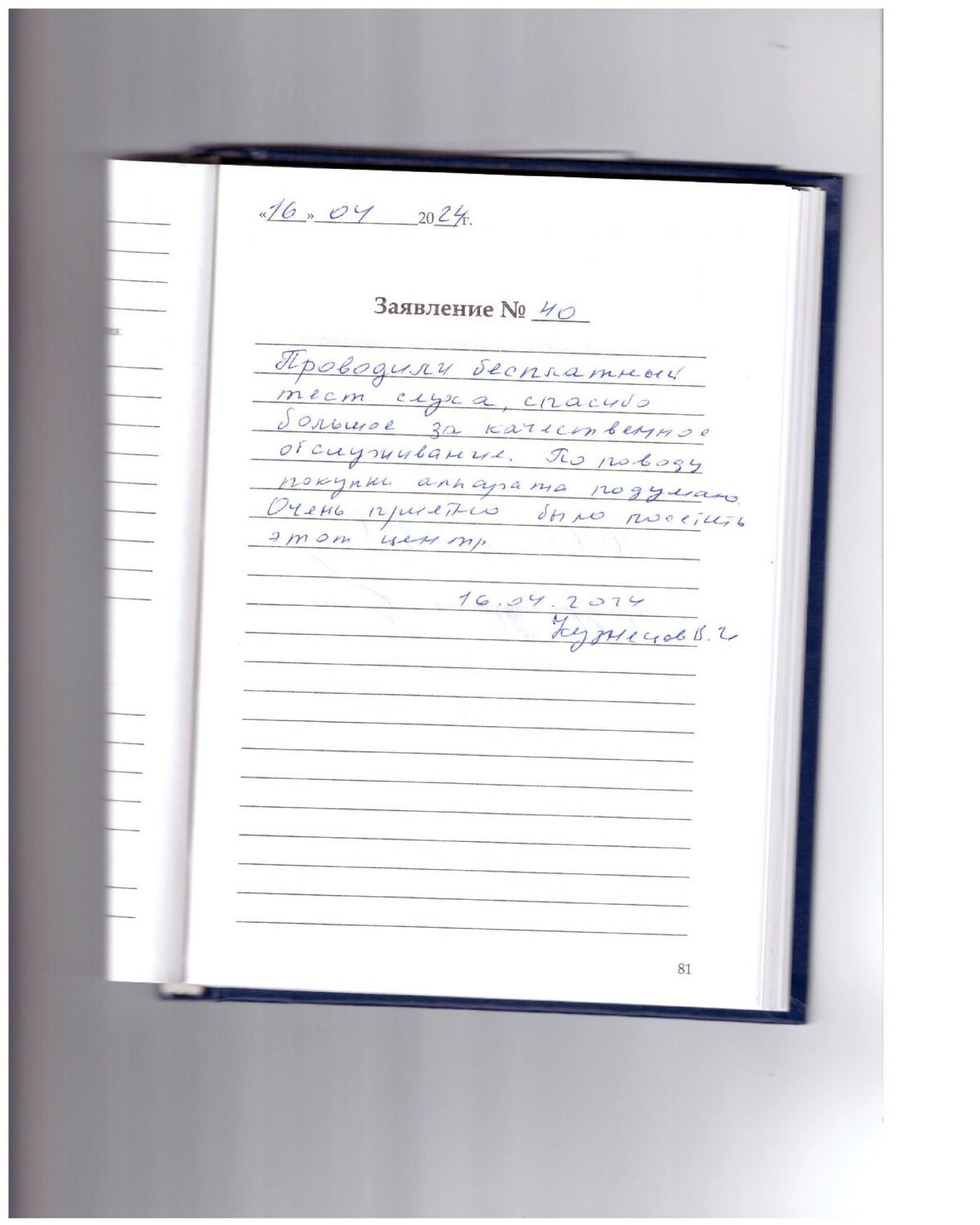 Проводили бесплатный тест слуха, спасибо большое за качественное обслуживание. По поводу покупки аппарата подумаю. Очень приятно было посетить этот центр.