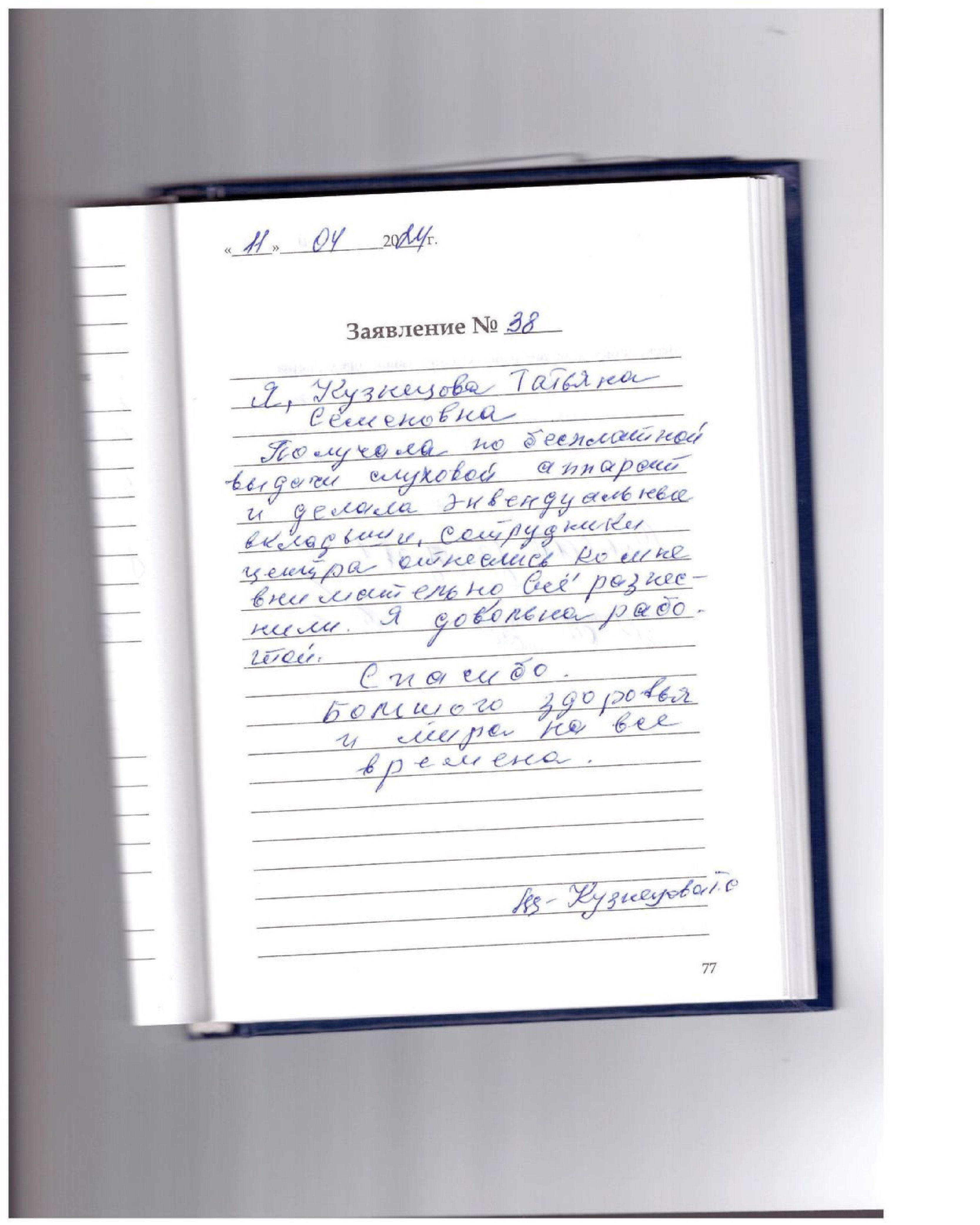 Я, Кузнецова Татьяна Семёновна, Получала по бесплатной выдаче слуховой аппарат и делала индивидуальные вкладыши. Сотрудники цента отнеслись ко мне внимательно, всё разъяснили. Я довольна работой. Спасибо. Большого здоровья и мира на все времена.
