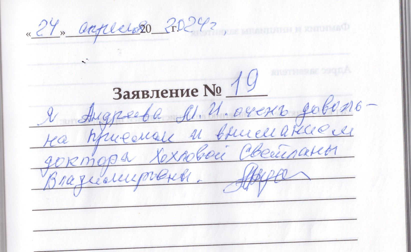 Я, Андреева М.И. очень довольна приемом и вниманием доктора Хохловой Светланы Владимировны