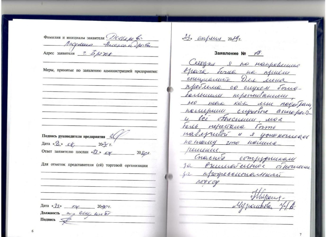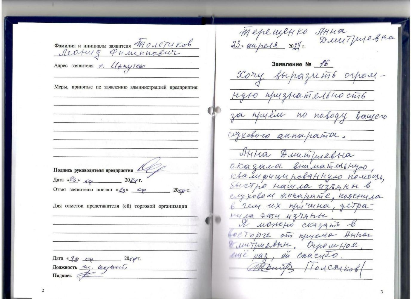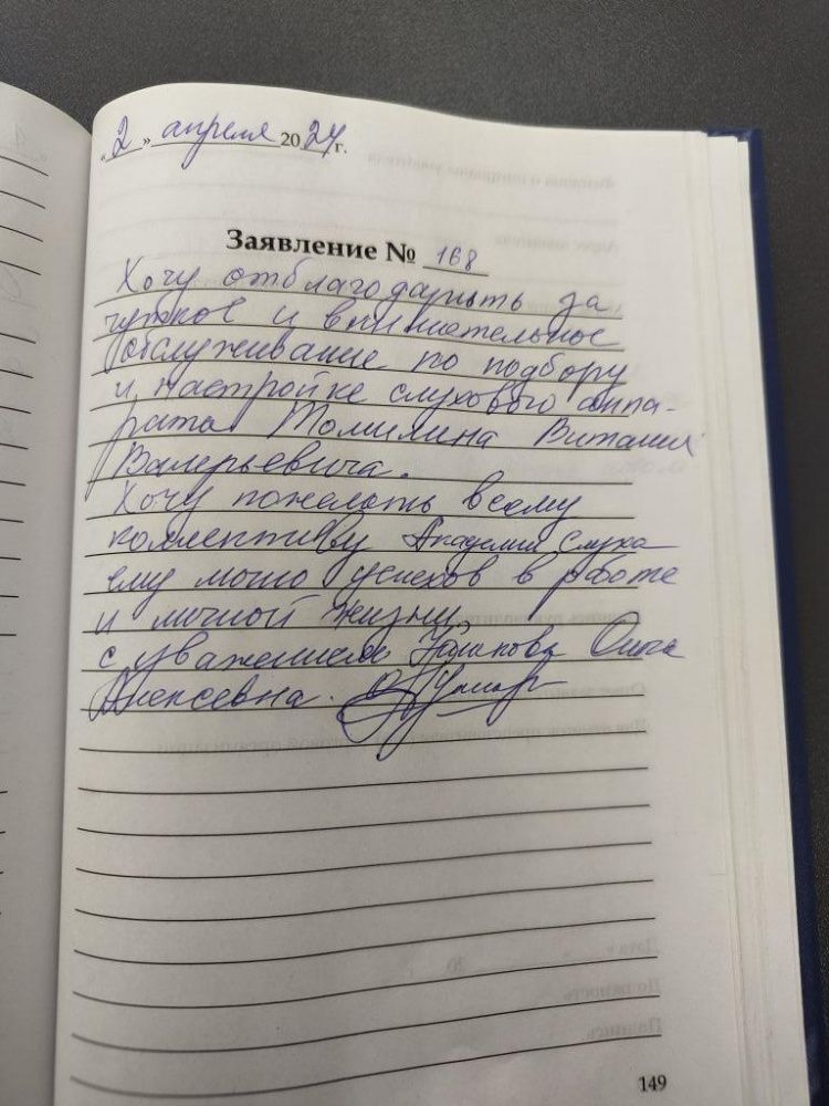 Хочу выразить огромную признательность за прием по поводу вашего слухового аппарата.