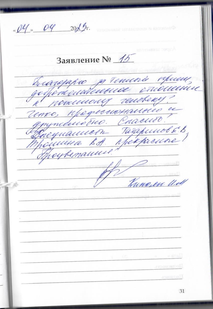 Благодарю за теплый прием, доброжелательное отношение к каждому человеку! Четко, профессионально и дружелюбно. Спасибо! Специалисты Татаринов Е.В. , Трошина В.А. прекрасные! Процветания! Киноян И.М.