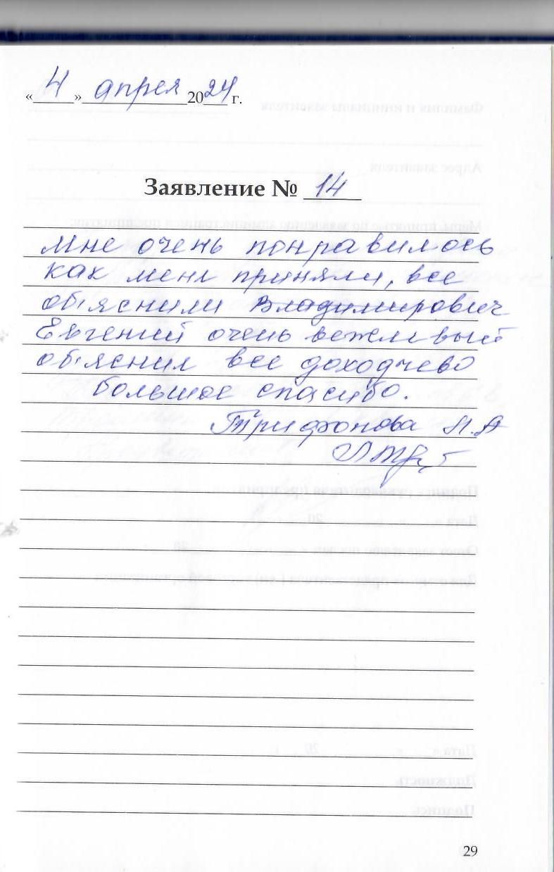 Мне очень понравилось как меня приняли, Евгений Владимирович очень вежливый, объяснил все доходчиво, большое спасибо. Трифонова Л.А.