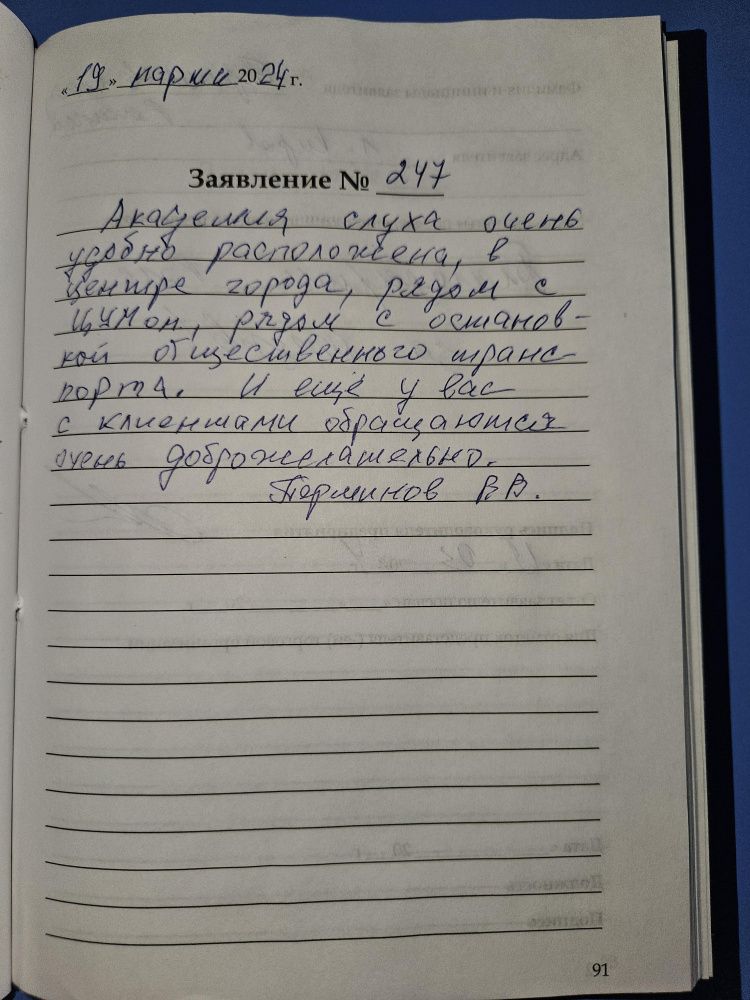 Я была в "Академии слуха" 10.04.2024. спасибо огромное всем работникам центра за внимательное т тактичное отношение"! Очень бережно были сделаны слепки для вкладышей.