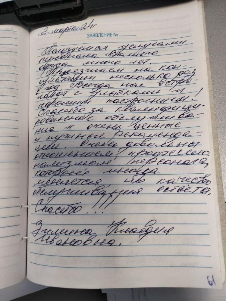 Пользуемся услугами вашего офиса много лет. Приезжаем на консультации несколько раз в год. Всегда нас встречают с улыбками и хорошим настроением! Спасибо за квалифицированное обслуживание и очень ценные и нужные рекомендации. Очень довольны отношением, профессионализмом персонала,который иногда меняется, но качество обслуживания остается.