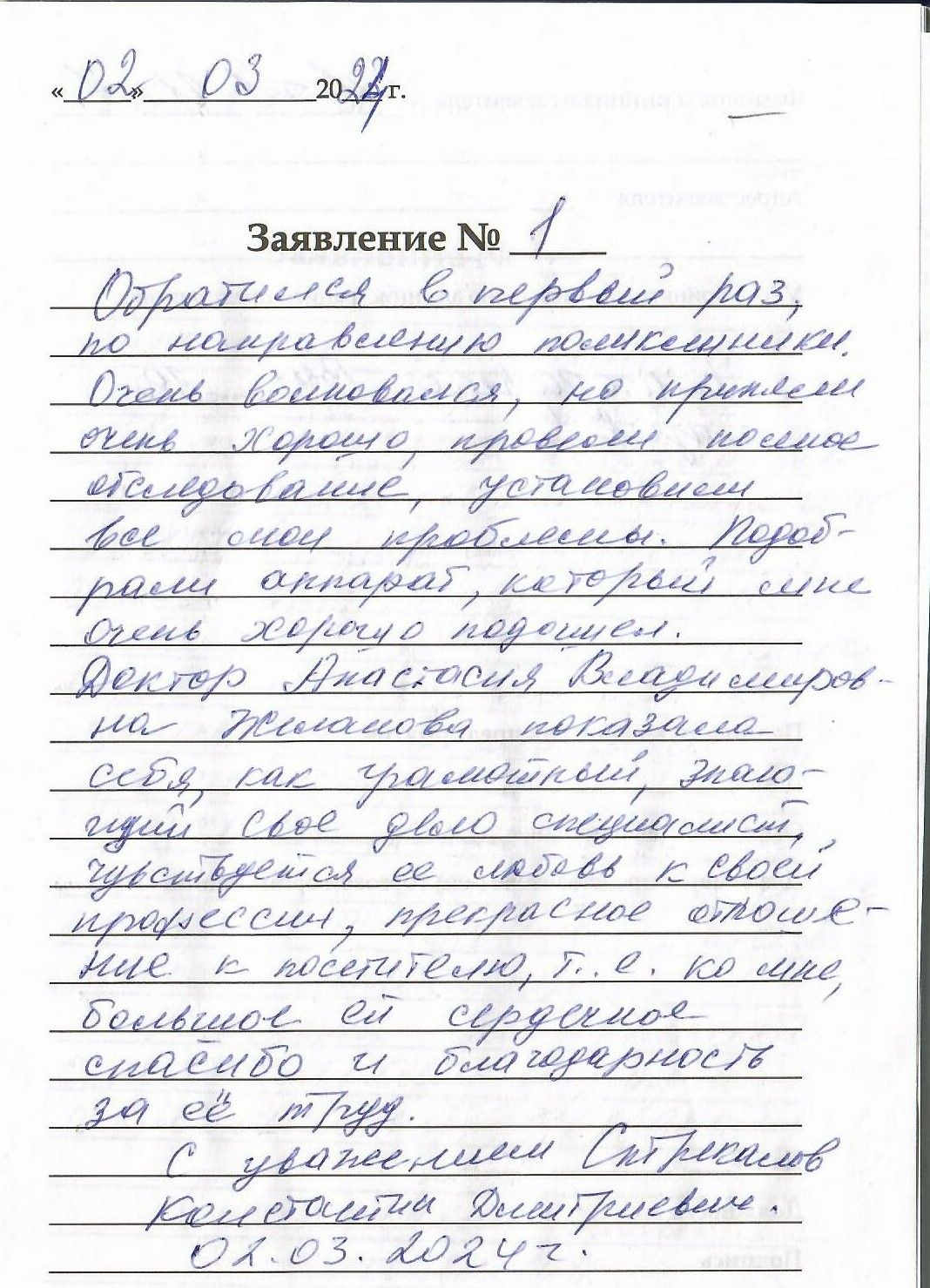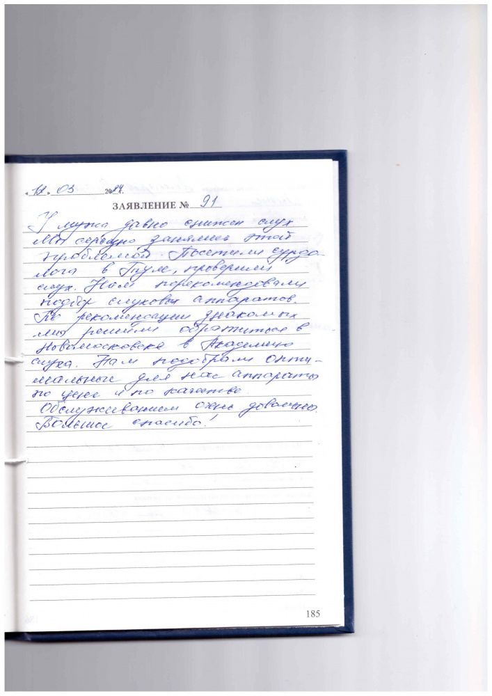 Обратился в первый раз по направлению поликлиники. Очень волновался, но приняли очень хорошо, провели полное обследование , установили все мои проблемы. Подобрали аппарат ,который мне очень хорошо подошел. Доктор Анастасия Владимировна Желанова показала себя, как грамотный, знающий свое дело специалист, чувствуется её любовь к своей профессии, прекрасное отношение к посетителю, т.е. ко мне, большое ей сердечное спасибо и благодарность за её труд. С уважением Стрекалов Константин Дмитриевич .