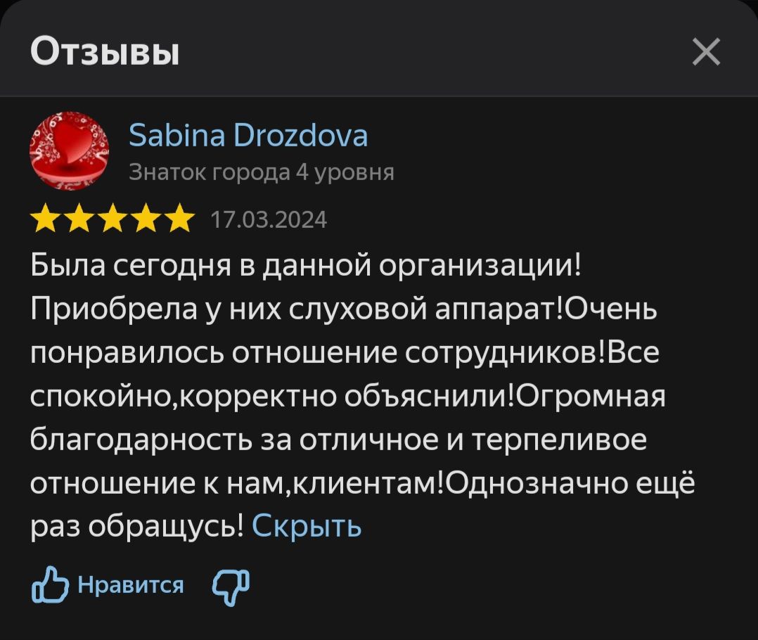 Была сегодня в данной организации! Приобрела у них слуховой аппарат! Очень понравилось отношение сотрудников! Все спокойно, корректно объяснили! Огромная благодарность за отличное и терпеливое отношение к нам, клиентам! Однозначно еще раз обращусь!