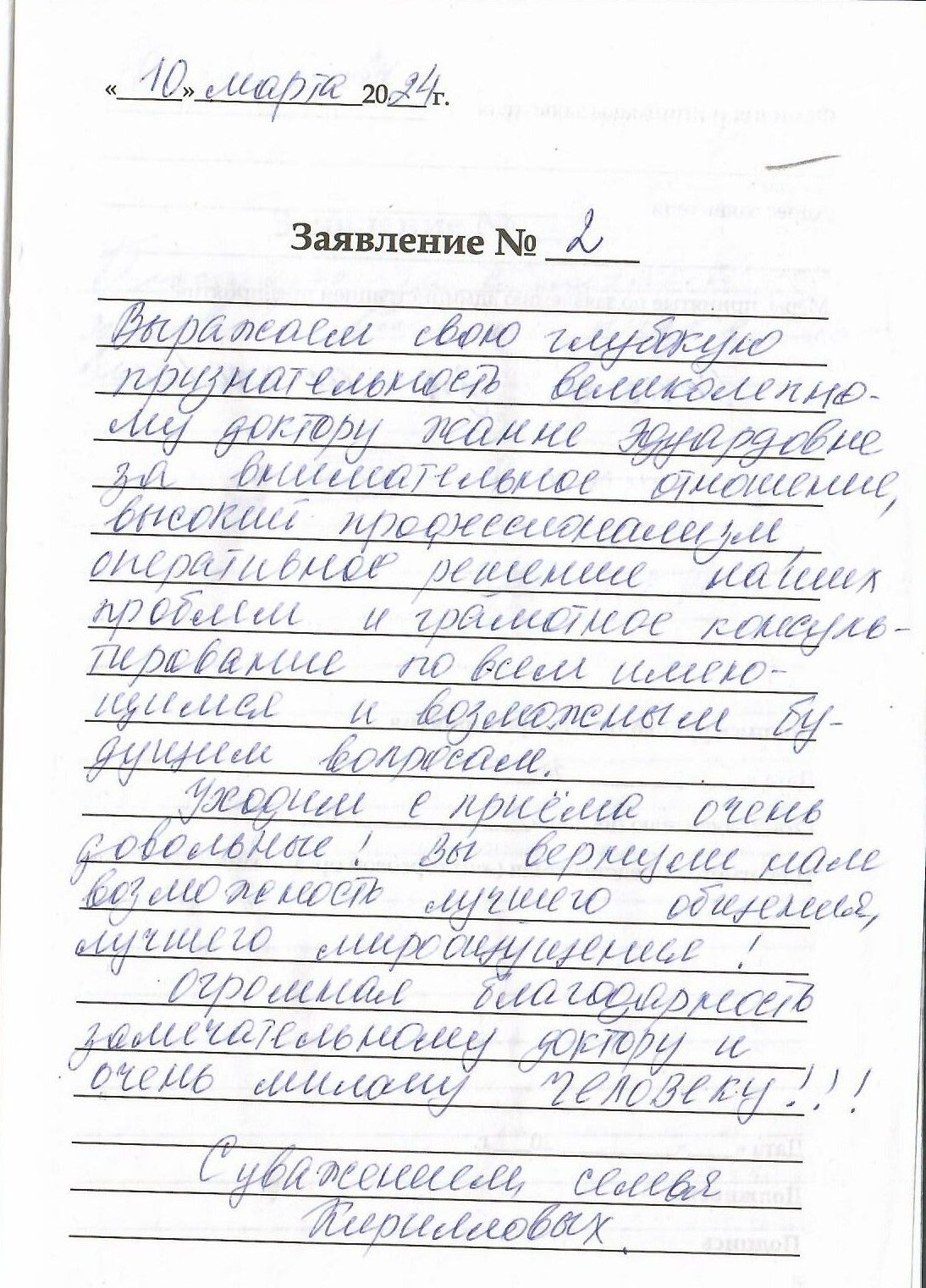 Выражаем свою глубокую признательность великолепному доктору Жанне Эдуардовне за внимательное отношение, высокий профессионализм оперативное решение наших проблем и грамотное консультирование по всем имеющимся и возможным будущим вопросам. Уходим с приёма очень довольны! Вы вернули нам возможность лучшего общения, лучшего мироощущения! Огромная благодарность замечательному доктору и очень милому человеку! С уважением семья Кирилловых.