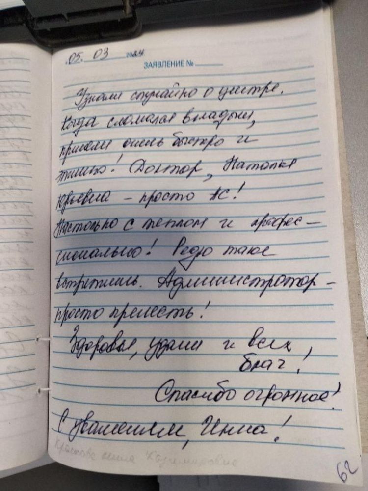 Узнали случайно о центре, когда сломался вкладыш, приняли очень быстро и этично! Доктор Наталья Юрьевна - просто ас! Настолько с теплом и профессионально! Редко такое встретишь. Администратор - просто прелесть! Здоровья, удачи и всех благ! Спасибо огромное! С уважением, Инна