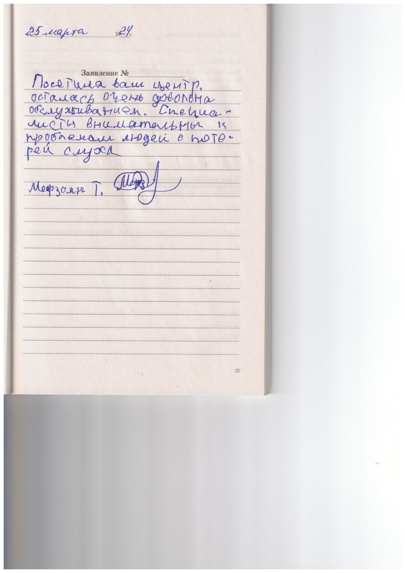 Посетила ваш центр. Осталась очень довольна обслуживанием. Специалисты внимательны к проблемам людей с потерей слуха. Мирзоян Т.