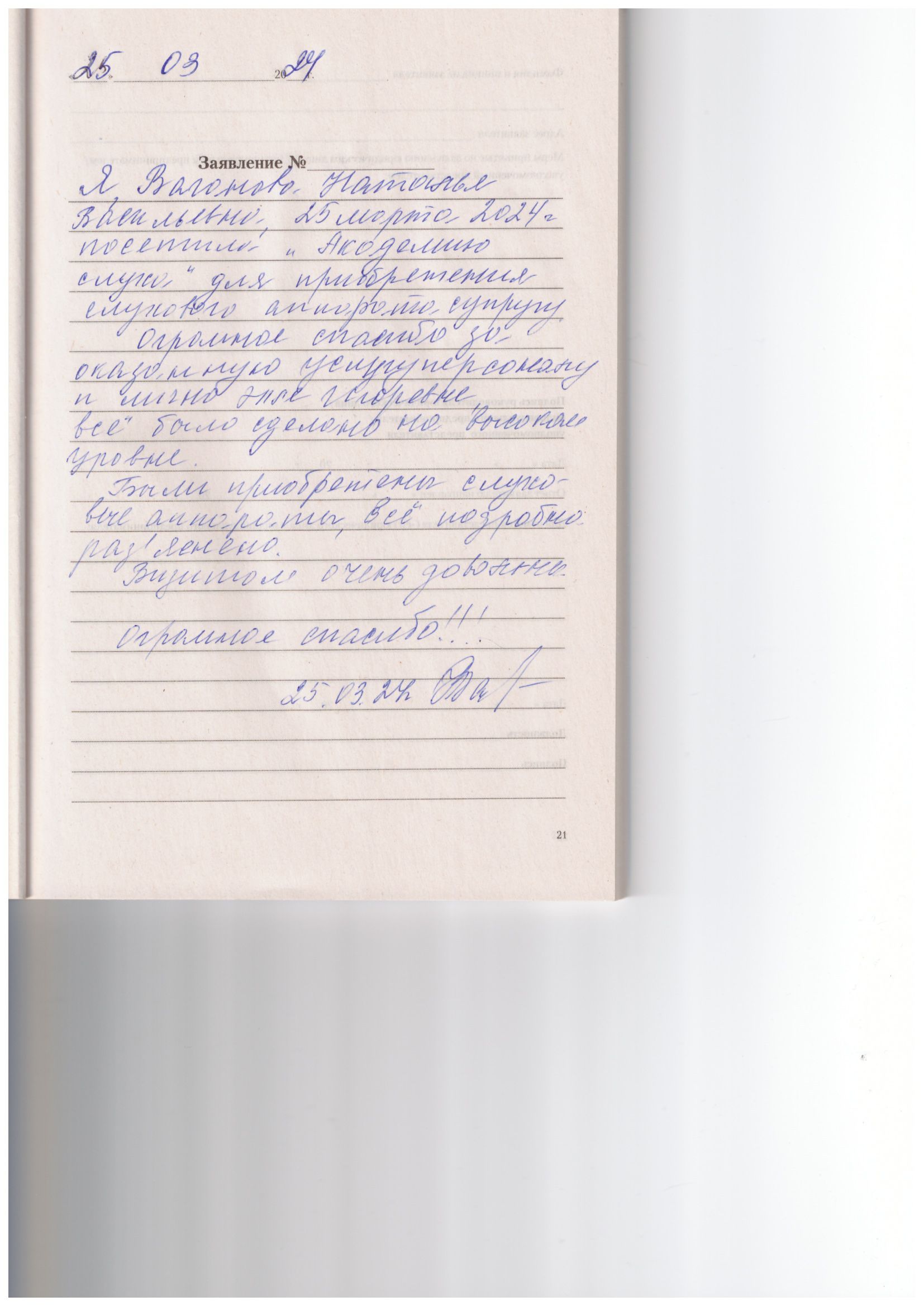 Я, Ваганова Наталья Васильевна, 25.03.2024 посетила Академию слуха для приобретения слухового аппарата супругу. Огромное спасибо за оказанную услугу персоналу и лично Элле Игоревне. Все было сделано на высоком уровне. Были приобретены слуховые аппараты, все подробно разъяснено. Визитом очень довольны. Спасибо огромное!