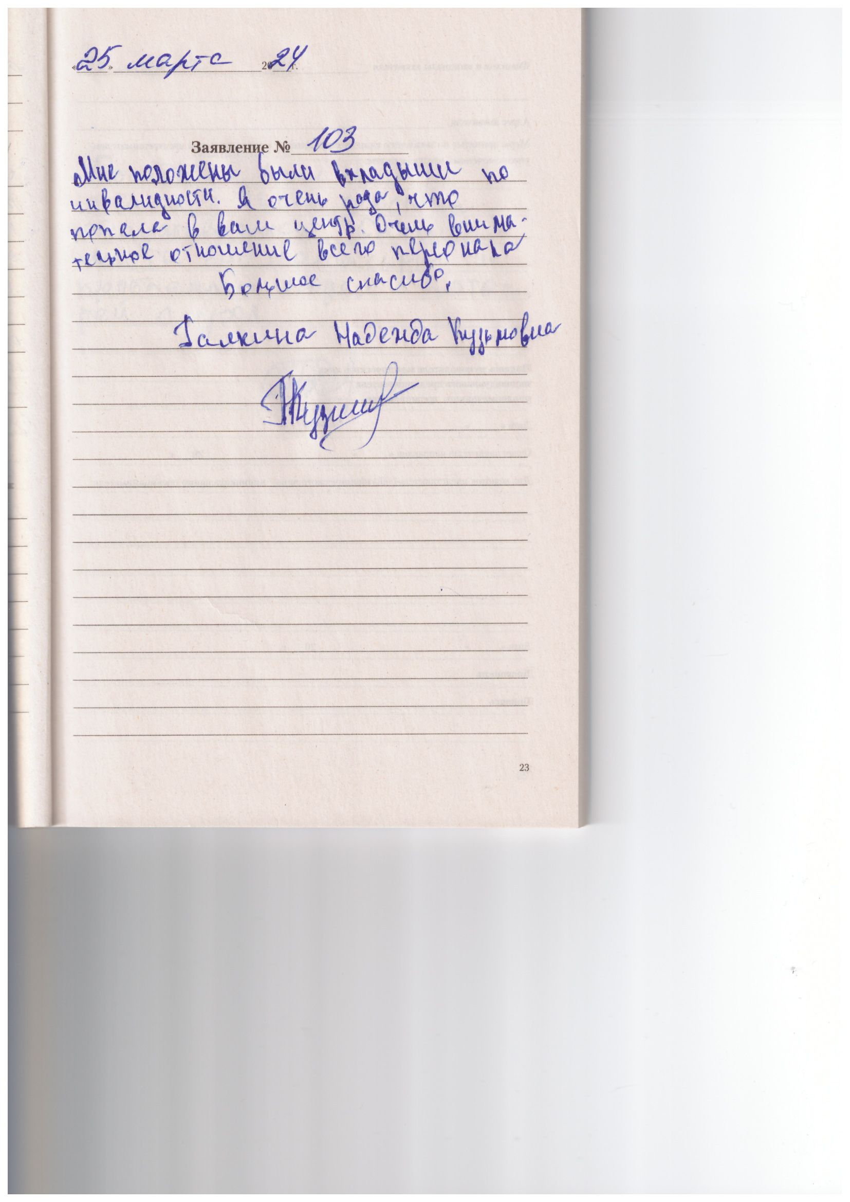 Мне положены были вкладыши по инвалидности. Я очень рада, что попала в ваш центр. Очень внимательное отношение всего персонала. Большое спасибо. Галкина Надежда Кузьмовна