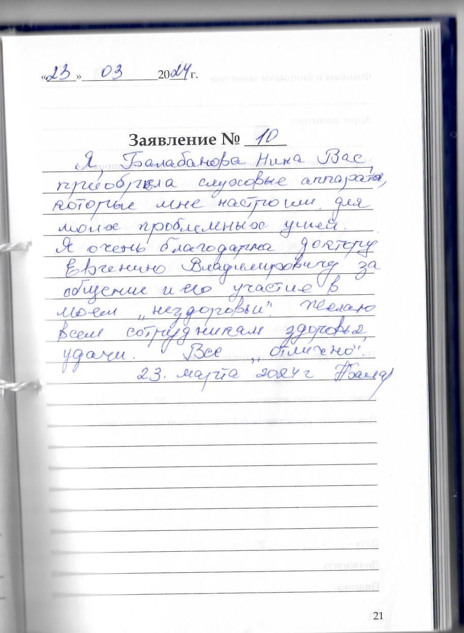 Я,Балабанова Нина Васильевна, приобрела слуховые аппараты, которые мне настроили для моих проблемных ушей. Я очень благодарна доктору Евгению Владимировичу за общение и его участие в моем "нездоровьи". Желаю всем сотрудникам здоровья, удачи.