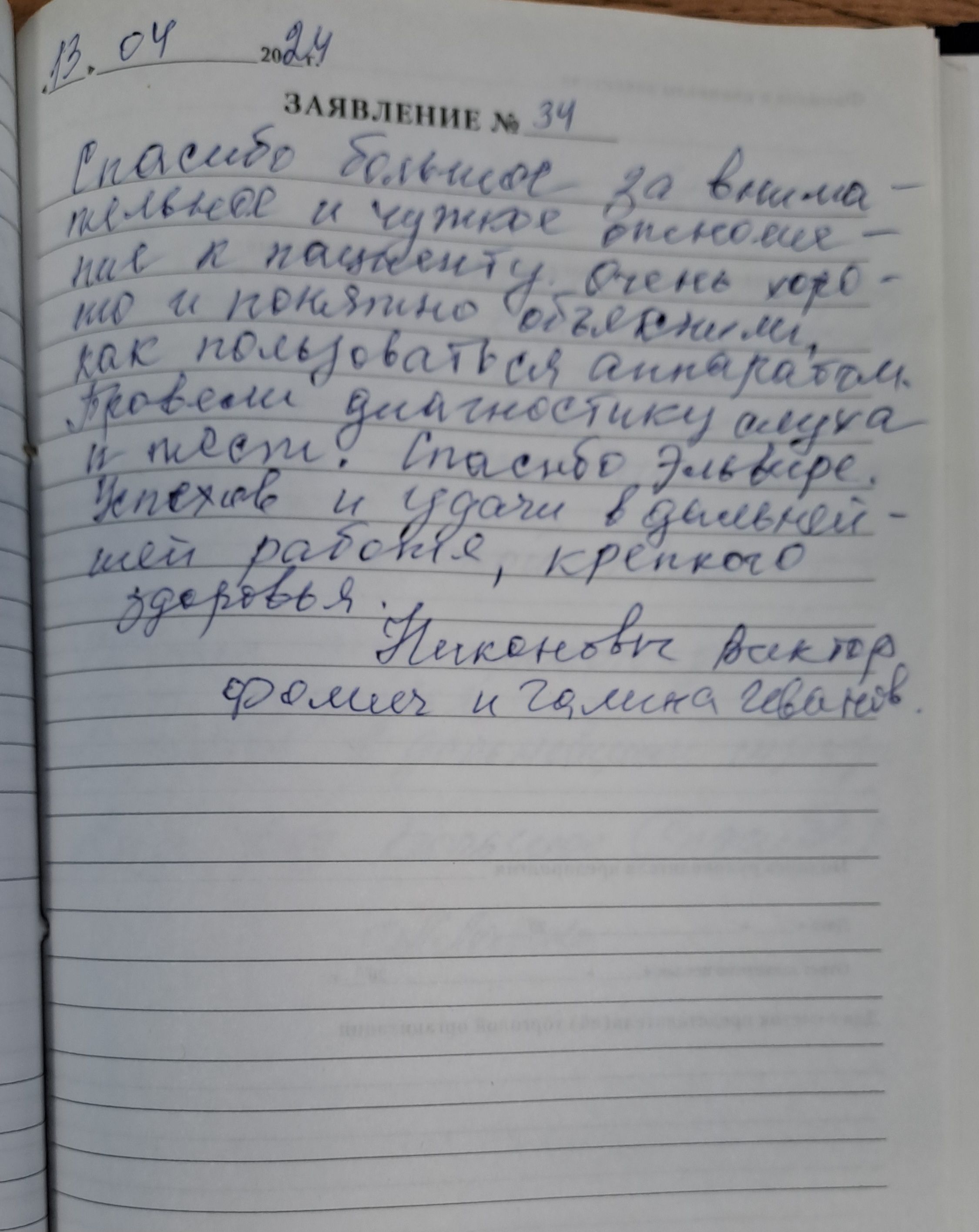Спасибо большое за внимательное и чуткое отношение к пациенту. Очень хорошо и понятно объяснили, как пользоваться аппаратом. Провели диагностику слуха и тест. Спасибо Эльвире. Успехов и удачи в дальнейшей работе, крепкого здоровья .