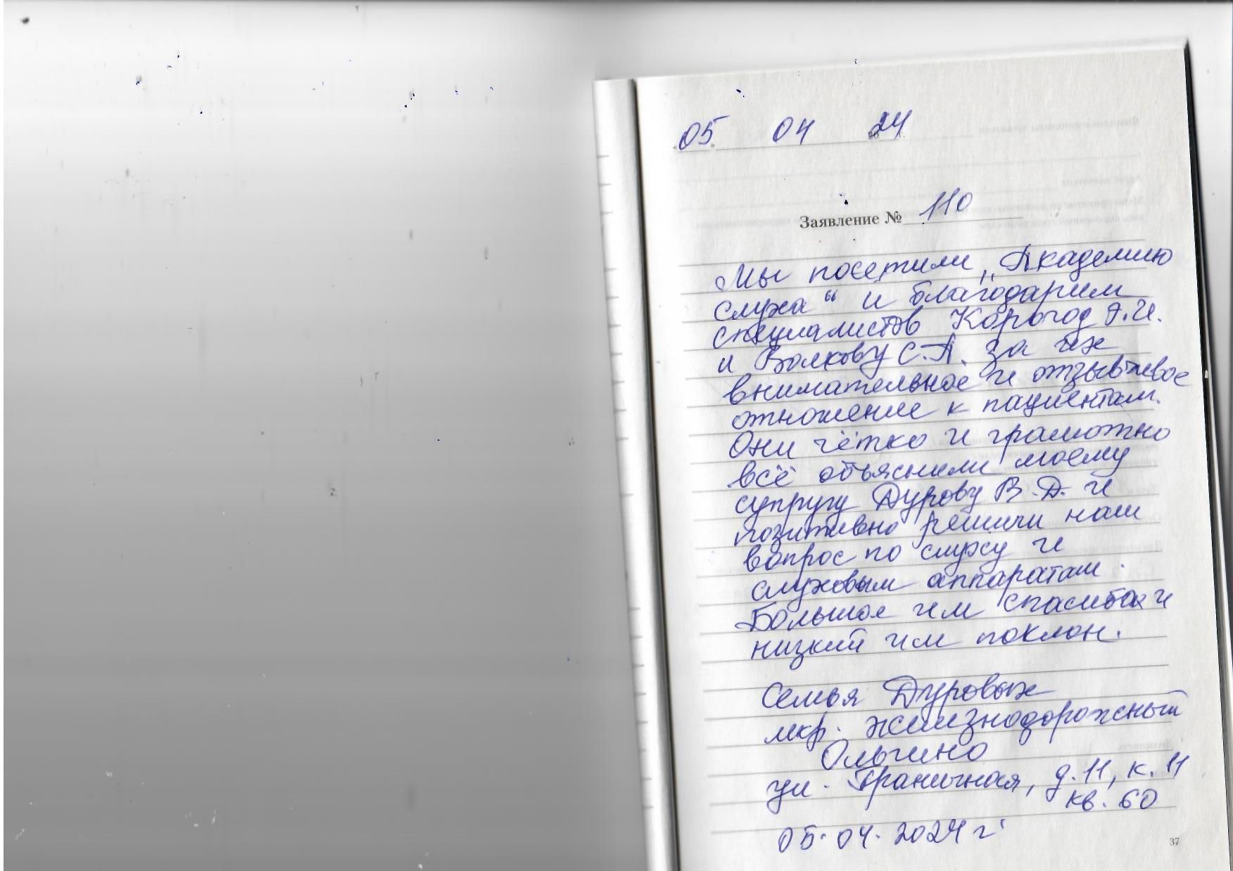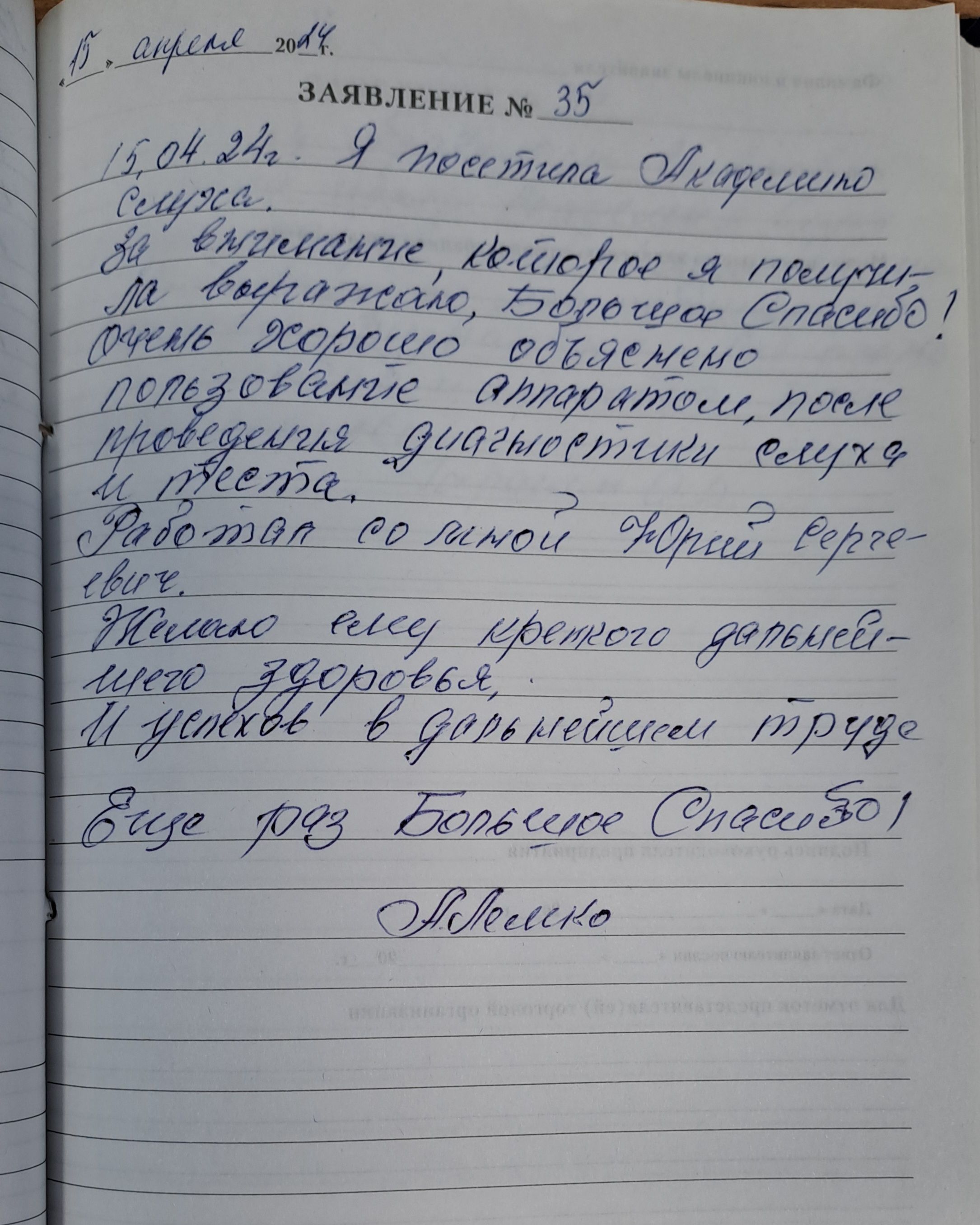 15.04.24г. Я посетила Академию слуха. За внимание которое я получила выражаю , Большое Спасибо! Очень хорошо объяснено пользование аппаратом, после проведения диагностики слуха и теста. Работал со мной Юрий Сергеевич. Желаю ему крепкого дальнейшего здоровья. И успехов в дальнейшем труде. Еще раз Большое спасибо!