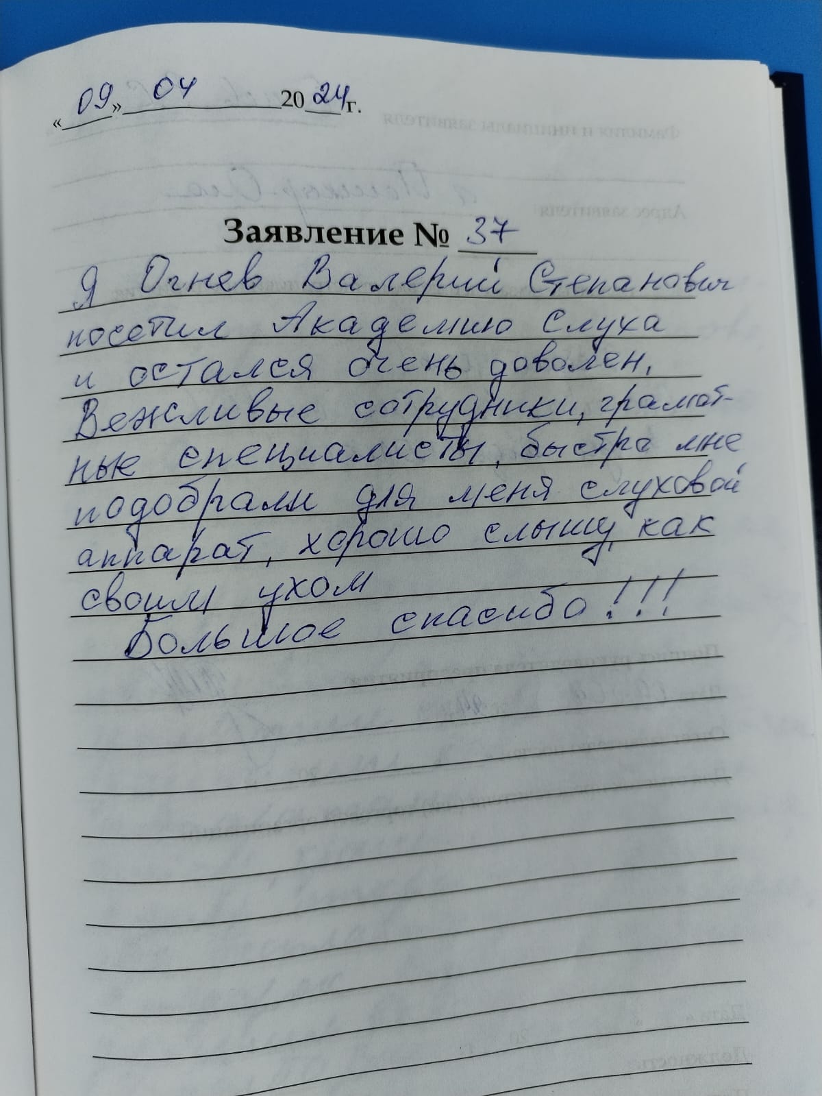 Я, Огнев Валерий Степанович, посетил Академию Слуха и остался очень доволен. Вежливые сотрудники, грамотные специалисты, быстро мне подобрали для меня слуховой аппарат, хорошо слышу, как своим ухом. Большое спасибо!!!