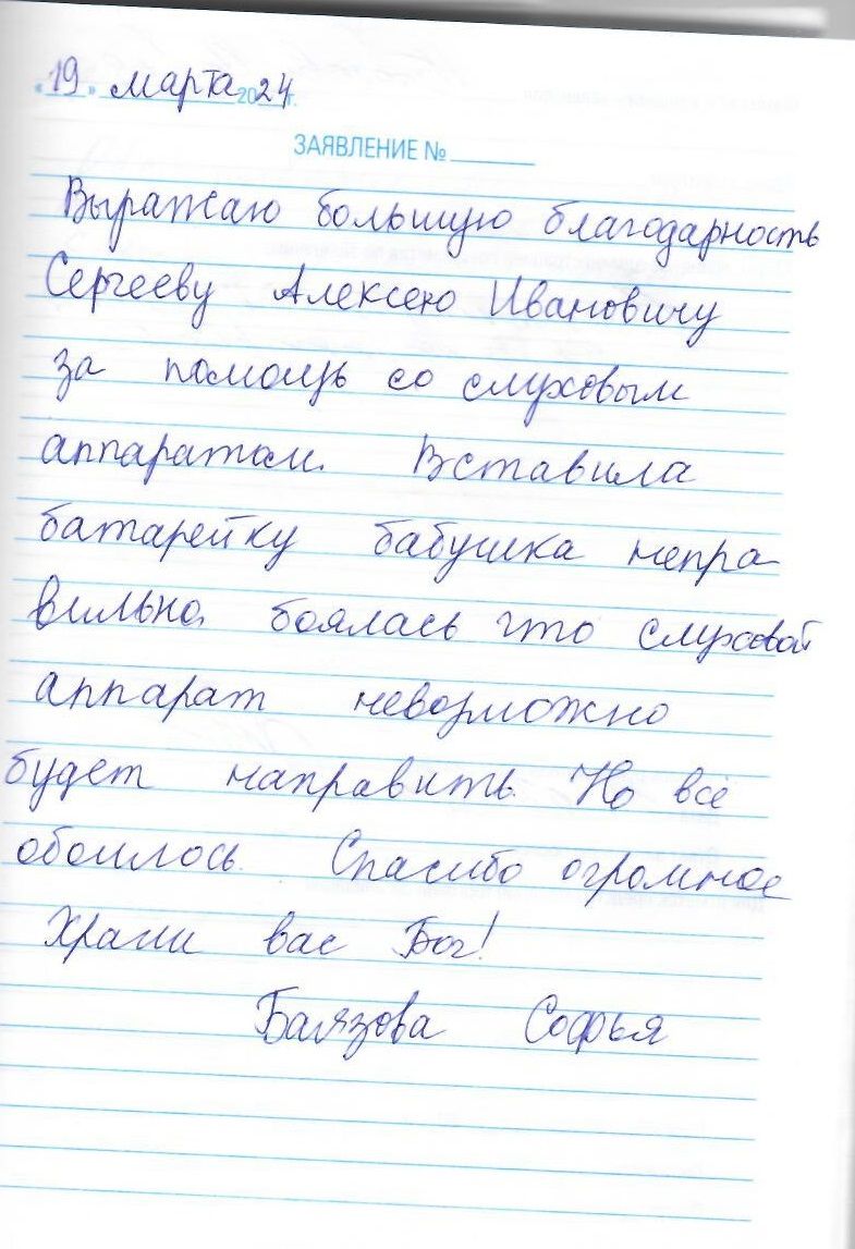Выражаю большую благодарность Сергееву Алексею Ивановичу за помощь со слуховым аппаратом. Вставила батарейку бабушка не правильно, боялась что слуховой аппарат невозможно будет направить, но всё обошлось. Спасибо огромное, храни Вас бог.