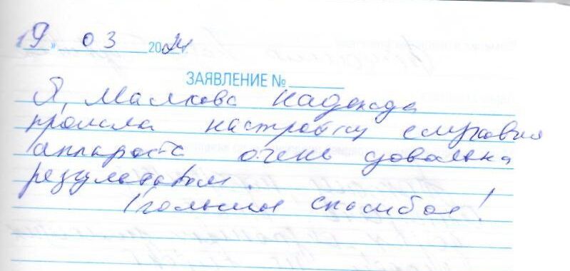 Я, Малкова Надежда прошла настройку слухового аппарата, очень довольна результатом. Большое спасибо!