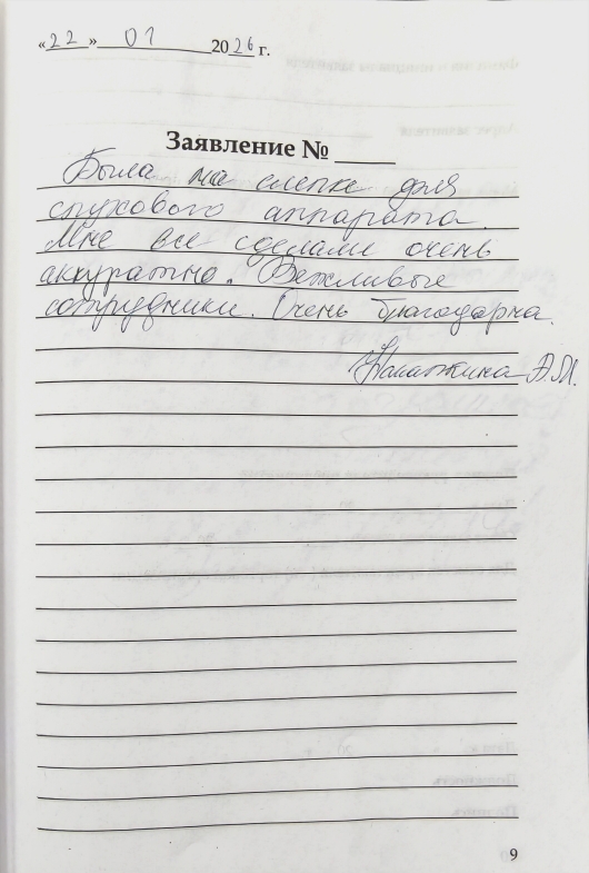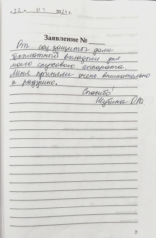 От соц.защиты дали бесплатный вкладыш для моего слухового аппарата. Меня приняли очень внимательно и радушно. Спасибо.