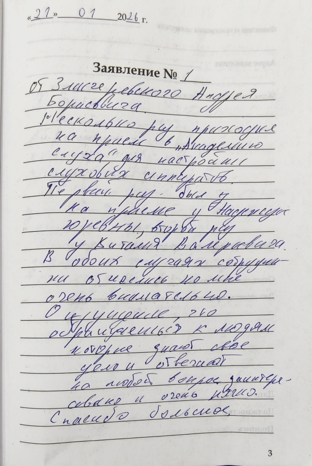 От Змичеревского Андрея Борисовича. Несколько раз приходил на прием в Академию Слуха для настройки слуховых аппаратов. Первый раз был на приеме у Надежды Юрьевны, второй раз у Виталия Валерьевича. В обоих случаях сотрудники отнеслись ко мне очень внимательно. Ощущение что обращаешься к людям которые знают свое дело и отвечают на любой вопрос. Заинтересованно и очень хорошо. Спасибо большое.